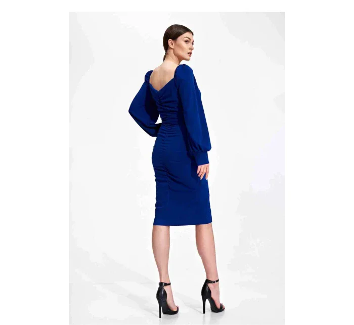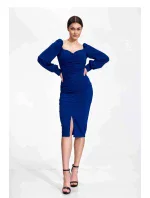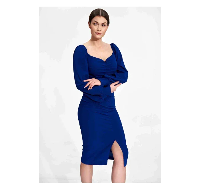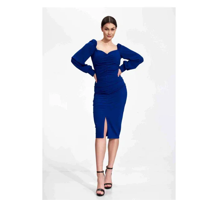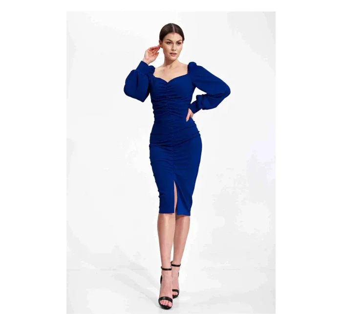 Midi koktejlové šaty z elastické látky s dlouhými bufetovými rukávy zakončenými nerozpáranou manžetou. Stahovací výstřih. Ozdobné řasení vpředu a vzadu po celé délce šatů. Jemný rozparek ve spodní části předního dílu. Šaty bez podšívky a bez zapínání.