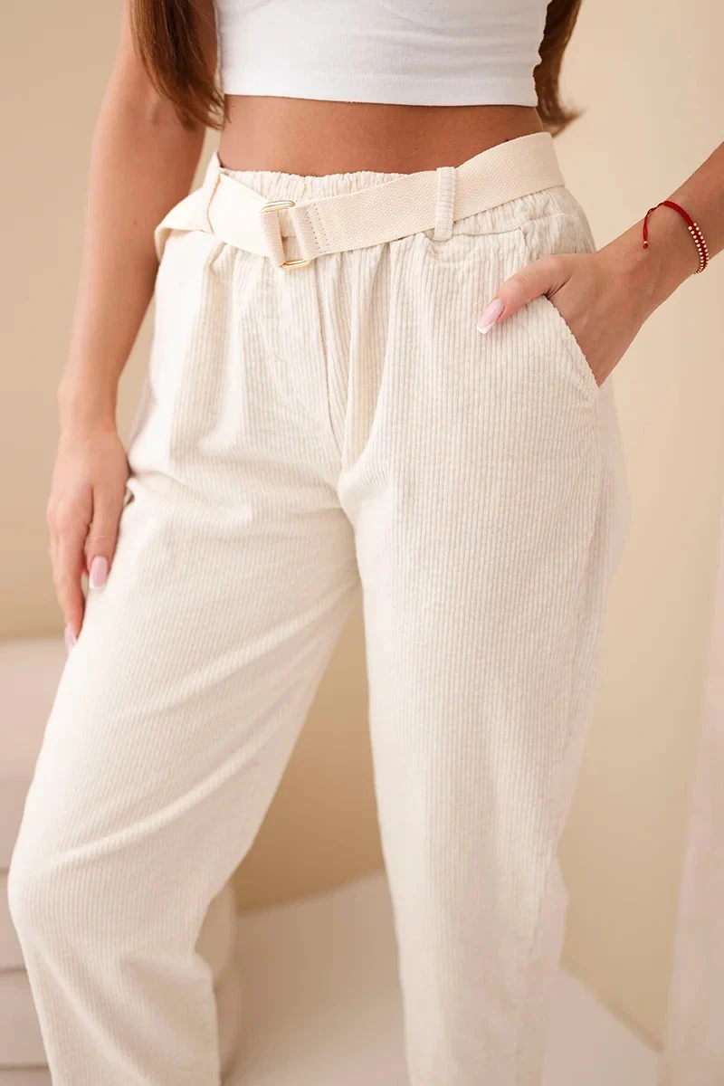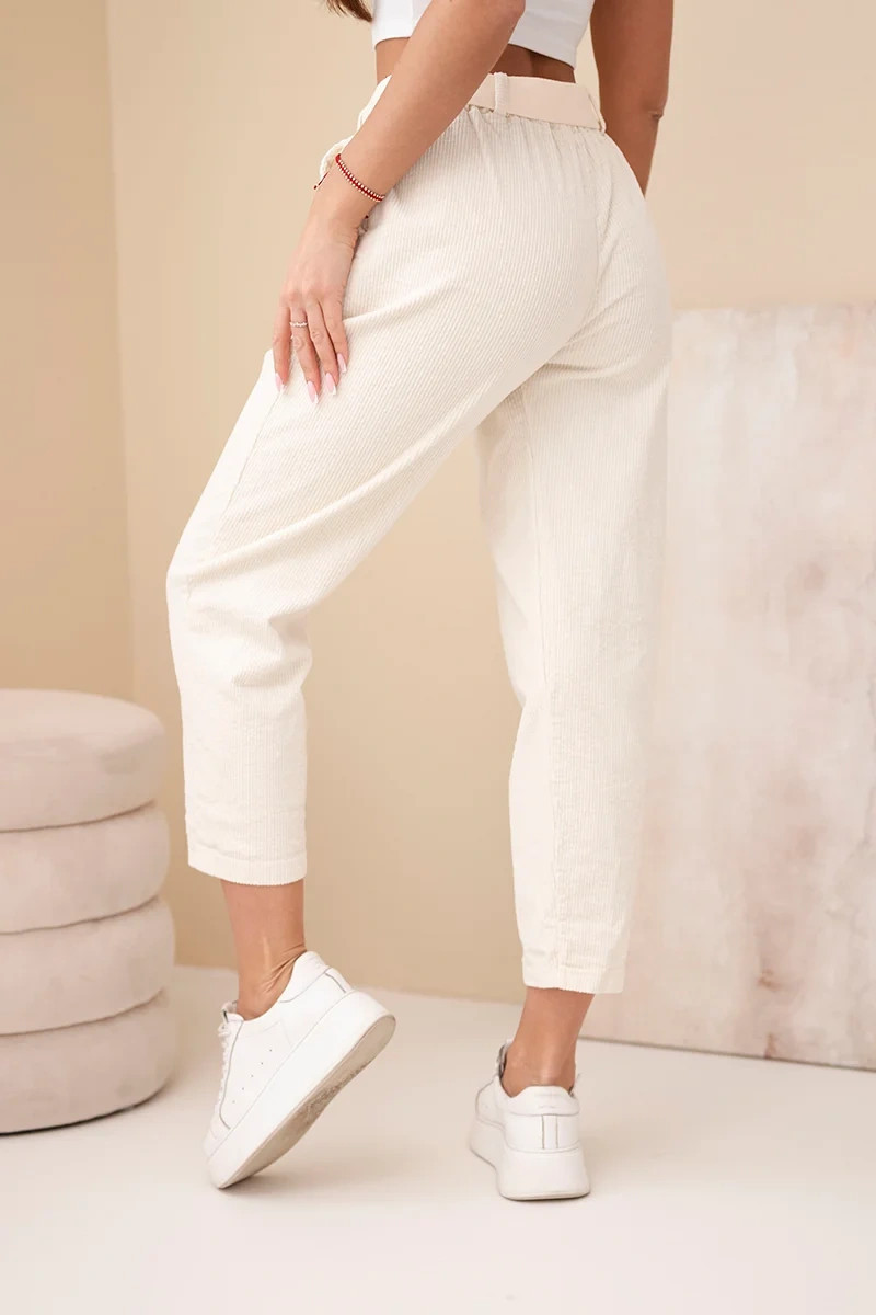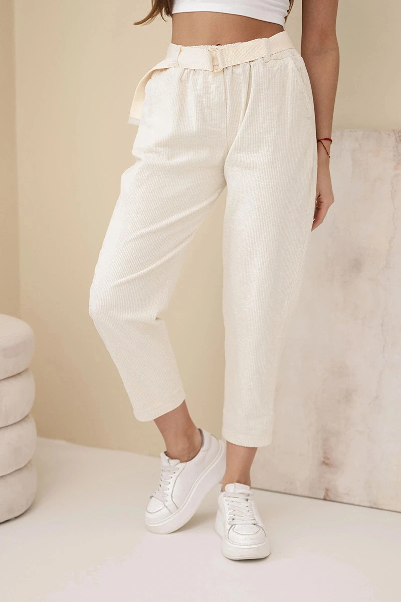 Pohodlné a módní dámské kalhoty z měkkého manšestru jsou skvělou volbou na chladnější dny. Jejich moderní střih se zúženými nohavicemi a elastickým pasem zajišťuje dokonalé přizpůsobení postavě a vysoký komfort nošení. Součástí soupravy je látkový pásek, který zvýrazňuje pas a dodává stylové zakončení celé stylizaci.