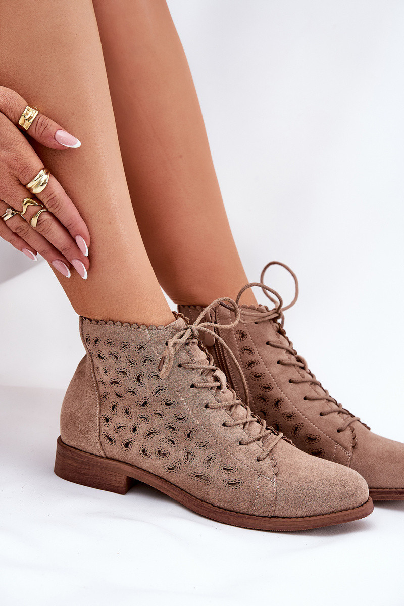 Dámské botky z eko semiše jsou stylovým návrhem na chladnější dny. Nízký svršek zdobený průhledným vzorem jim dodává lehkost. Šněrování a zip umožňují snadné obouvání a přizpůsobení noze. Tyto botky budou vynikající volbou pro každodenní stylizace, kombinující funkčnost s módním vzhledem. Při výběru velikosti se řiďte tabulkou velikostí.