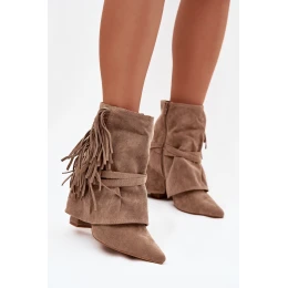 Dámské kotníkové boty na jehlovém podpatku s třásněmi a zlatými přezkami béžové model 21757497 - Boto