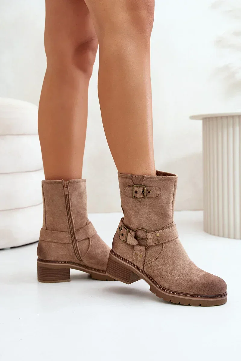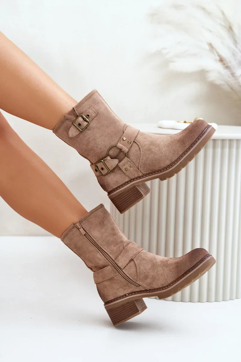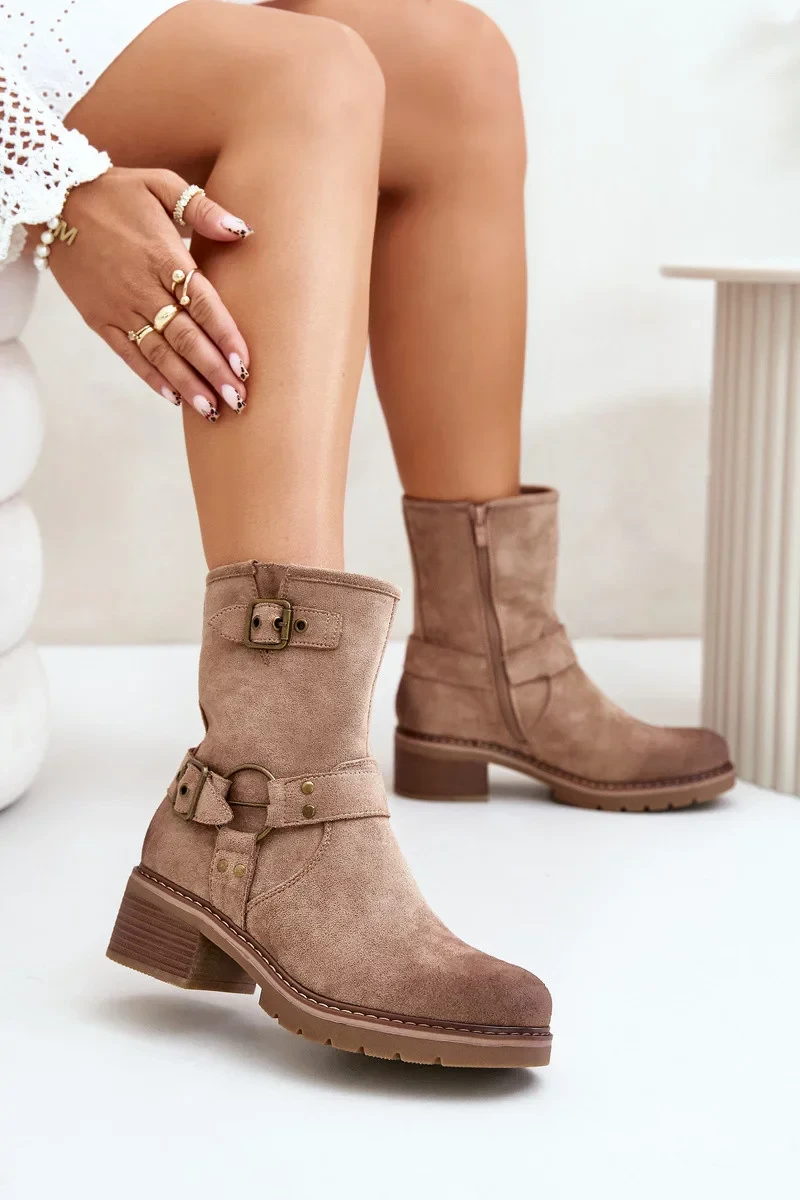 Dámské Kotníkové Boty Na Nízkém Podpatku S Přezkami Tmavě Béžové Zudra