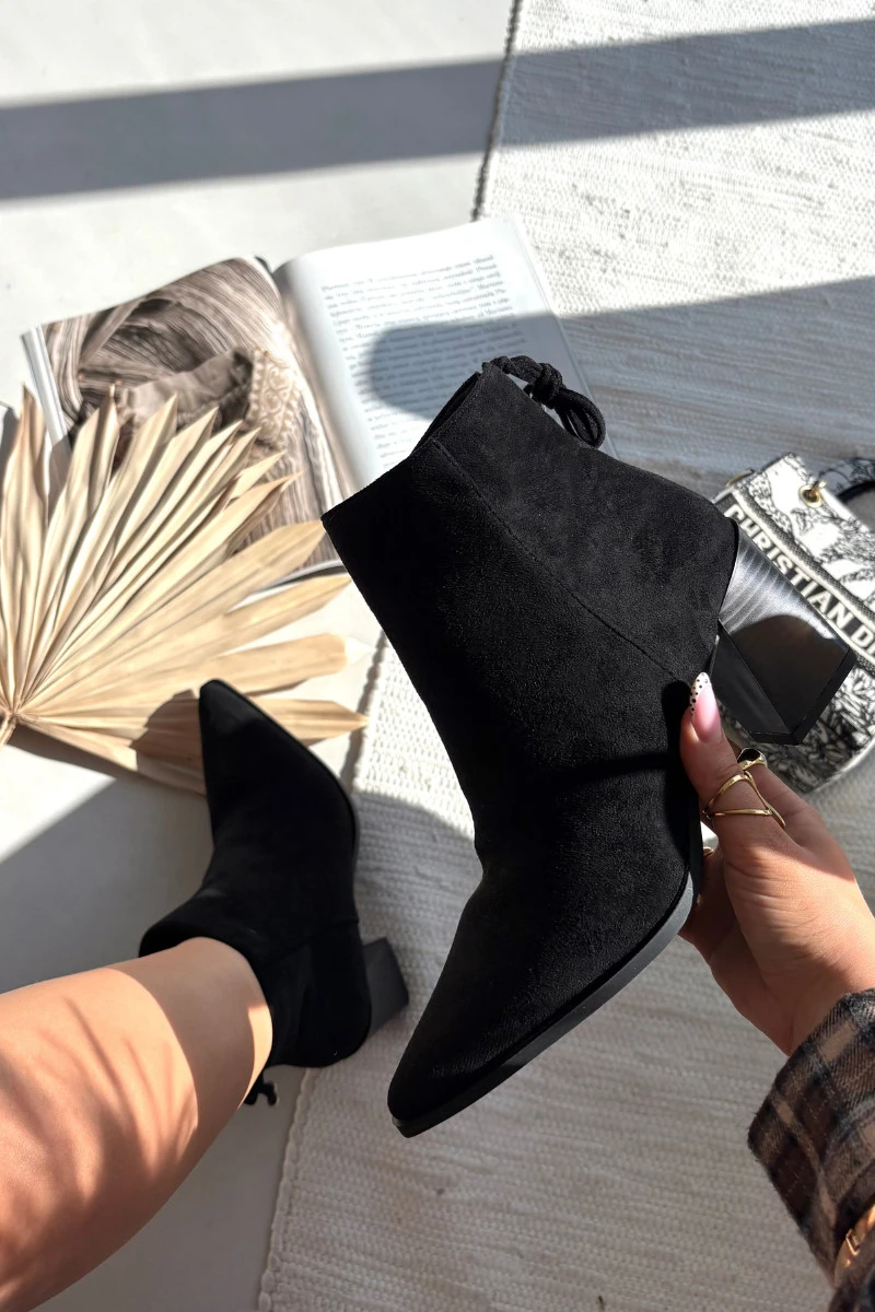 Dámské kotníky vyrobené z ekologického semiše. Umístěny na stabilním sloupkovém podpatku, který jemně zeštíhluje siluetu, a špičaté špičky jim dodávají ženský charakter. Model se vyznačuje zavazováním vzadu na horní části boty, které slouží jako dekorativní prvek. Ideální kotníky do každodenního i elegantního stylu. Při výběru velikosti se řiďte tabulkou velikostí.