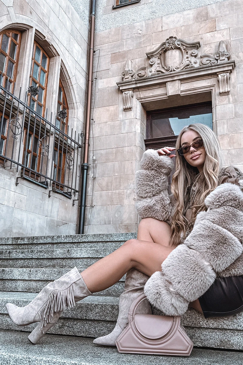 Dámské kozačky vyrobené z měkké ekologické semiše. Model na stabilním podpatku typu sloupek a s úzkými špičkami krásně zeštíhluje nohy a dodává siluetě lehkost. Naskládaná výška a ozdobné třásně dodávají celku jedinečný, stylový charakter. Boty jsou zapínané na zip, což usnadňuje jejich obouvání. Vnitřek s teplým podšitím zajišťuje teplo a komfort v chladnějších dnech. Ideální volba pro ženy, které mají rády spojení pohodlí s trochou boho elegance — skvělé jak k kalhotám, tak ke šatům.