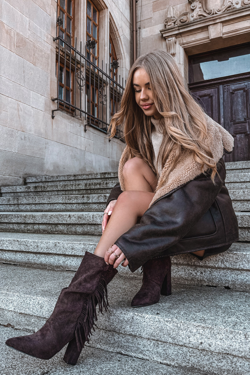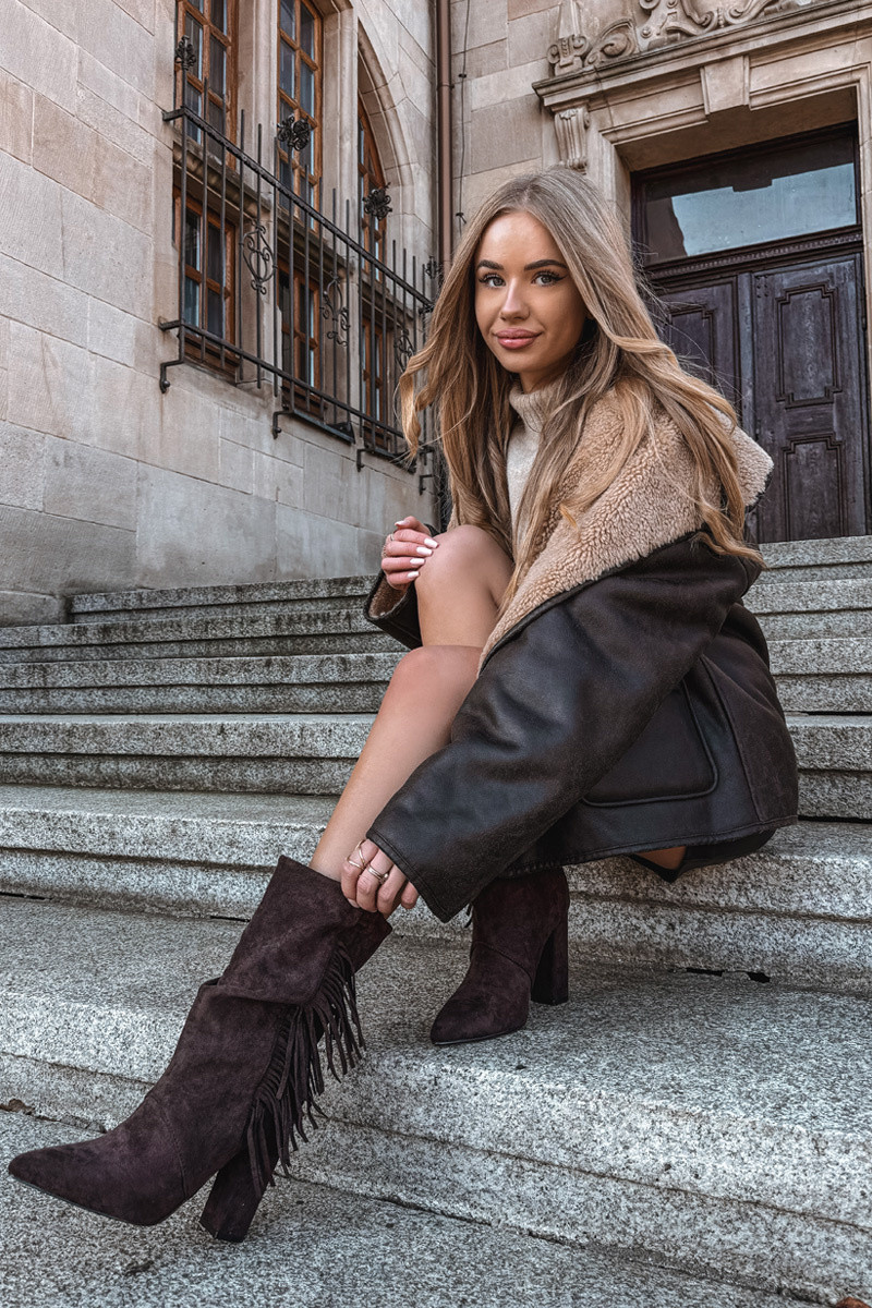 Dámské kozačky vyrobené z měkké ekologické semiše. Model na stabilním podpatku typu sloupek a s úzkými špičkami krásně zeštíhluje nohy a dodává siluetě lehkost. Naskládaná výška a ozdobné třásně dodávají celku jedinečný, stylový charakter. Boty jsou zapínané na zip, což usnadňuje jejich obouvání. Vnitřek s teplým podšitím zajišťuje teplo a komfort v chladnějších dnech. Ideální volba pro ženy, které mají rády spojení pohodlí s trochou boho elegance — skvělé jak k kalhotám, tak ke šatům.