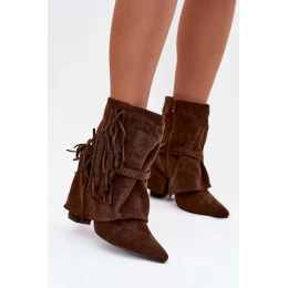 Dámské kotníkové boty na podpatku s třásněmi a zlatými hnědé Damskie model 21757504 - Boto