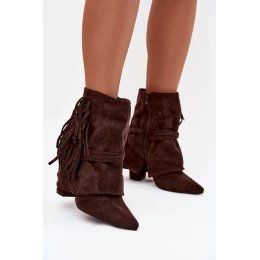 Dámské kotníkové boty na podpatku s třásněmi a zlatými přezkami čokoládové model 21757511 - Boto