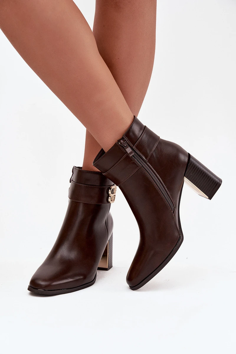 Dámské kotníkové boty na sloupku Galinne s páskem a zlatým detailem – čokoládová
