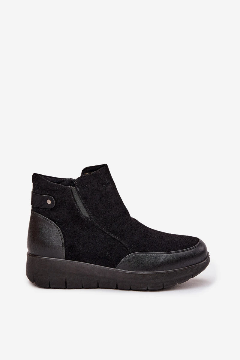 Dámské kotníkové boty vyrobené z kombinace ekologického semiše a ekologické kůže. Model je osazen na platformě, což zajišťuje pohodlí a stabilitu při chůzi. Vnitřek je vyzdoben silným kožíškem, který účinně chrání před chladem a zaručuje komfort v mrazivých dnech. Zaoblené špičky dodávají celkovému vzhledu klasický styl a praktické zapínání na zip usnadňuje oblékání a sundávání. Tyto boty se skvěle hodí pro každodenní nošení, nabízejí zároveň teplo, pohodlí a módní styl v podzimně-zimním období. Při výběru velikosti se řiďte tabulkou velikostí. Při výběru velikosti se řiďte tabulkou velikostí.