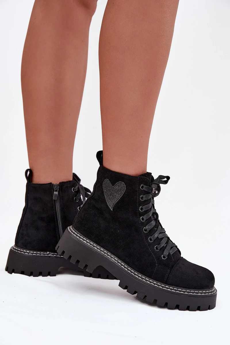Dámské boty vyrobené z eko semiše. Model se zapínáním na zip a dodatečným šněrováním, což zajišťuje dokonalé padnutí na nohu. Zaoblené špičky zaručují pohodlí při nošení. Svršek zdobený lesklým srdcem dodává kouzlo a jedinečný charakter. Ideální na každodenní nošení, skvěle doplní casualní styl. Při výběru velikosti se řiďte tabulkou velikostí.