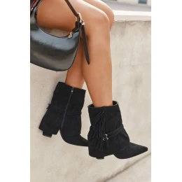Dámské kotníkové boty z eko semiše jsou ideální kombinací stylu a originálních detailů, které přitahují pozornost. Vyšší část nad patou jemně zeštíhluje siluetu a špičaté nosy přidávají eleganci a ženský charakter. Model je ozdoben třásněmi a tenkými pásky se zlatými přezkami, což přináší módní akcent a dodává mu výjimečný, moderní vzhled. Boty se skvěle hodí jak k ležérním outfitům, tak i k formálnějším stylizacím, do kterých vnášejí nádech originality a stylu. Komfortní a působivé, jsou skvělou volbou na denní nošení i na speciální příležitosti. Při výběru velikosti se řiďte tabulkou velikostí. Při výběru velikosti se řiďte tabulkou velikostí.