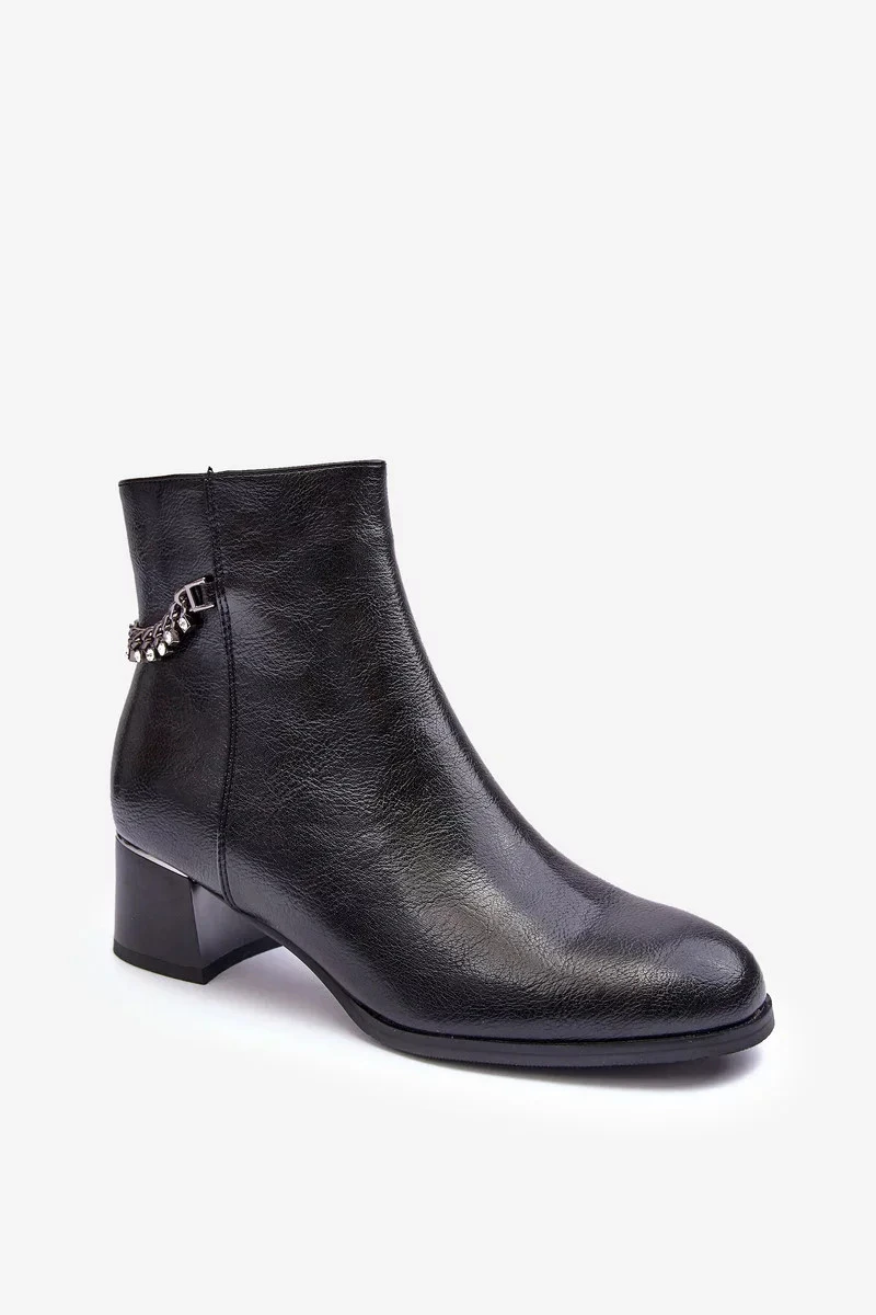 Klasické dámské boty na nízkém podpatku s lesklým prvkem. Vyrobeno z ekologické kůže. Zapíná se na zip na vnitřní straně. Horní část je ozdobena řetězem s kamínky. Vnitřek je zateplen kožešinou. Špička je zesílená a špička je zaoblená. Při výběru velikosti se řiďte tabulkou velikostí.