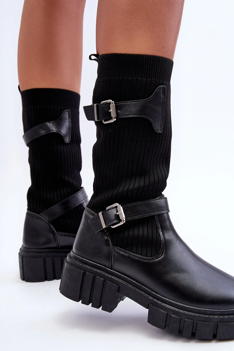 Dámské, módní zimní boty jsou vyrobeny z eko kůže a látky. Střih do poloviny lýtka s dekoračními pásky na obuvi. Osazené na masivní platformě s pevnou špičkou. Měkká, materiálová vložka zajišťuje pohodlné nošení. Tento model je nazouvací a má ponožkovou choleň. Při výběru velikosti se řiďte tabulkou velikostí.