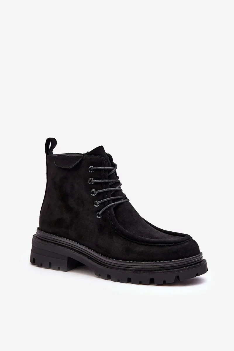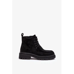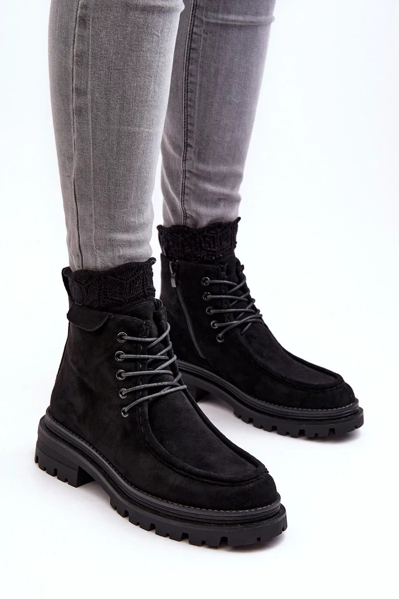 Dámské kozačky vyrobené z eko semiše. Zapínání na zip na boku. Uvnitř zateplené dekou na boty. Plochý podpatek a platforma zajišťují stabilitu na každém kroku. Dodatečné šněrování vpředu. Zaoblené prsty. Vyztužená pata. Boty jsou ideální pro zimní dny! Při výběru velikosti se řiďte tabulkou velikostí.
