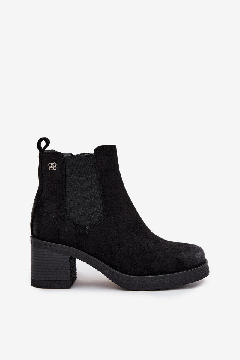 Černé zateplené boty Zelia z eko semiše. Jsou osazeny sloupkovým podpatkem (cca 7 cm), mají boční zip pro pohodlné nazouvání a vnitřní zateplení pro teplo během chladných dní. Elegantní design s jemným zlatým detailem po straně podtrhuje stylovou praktičnost.