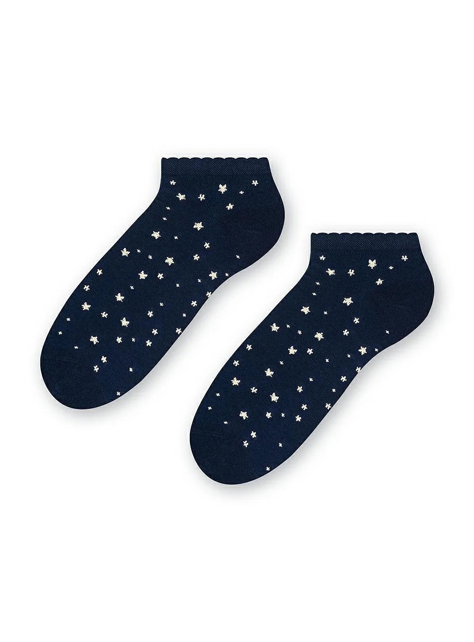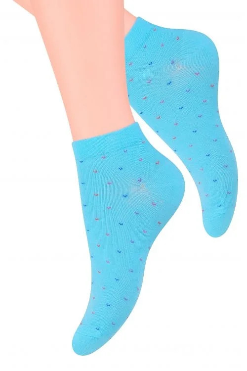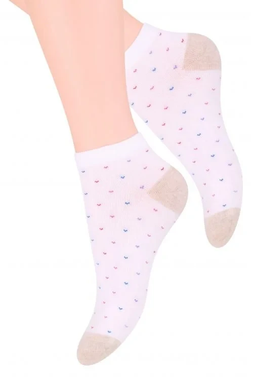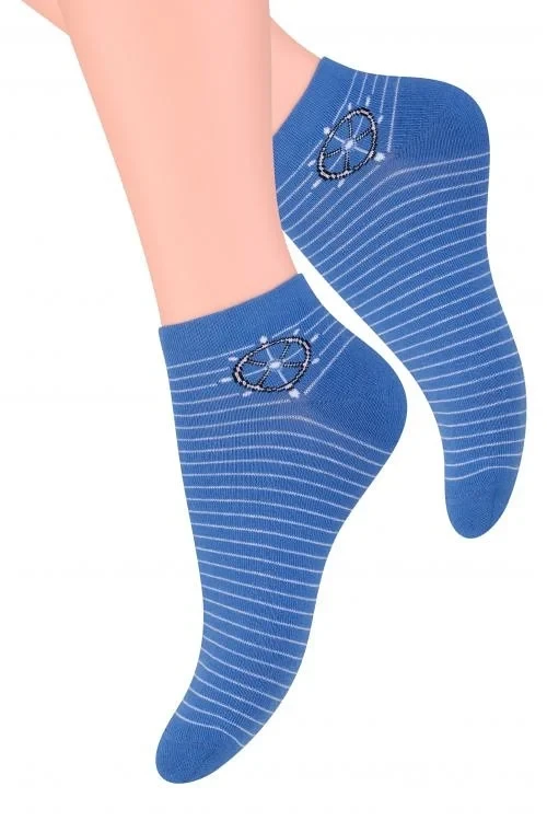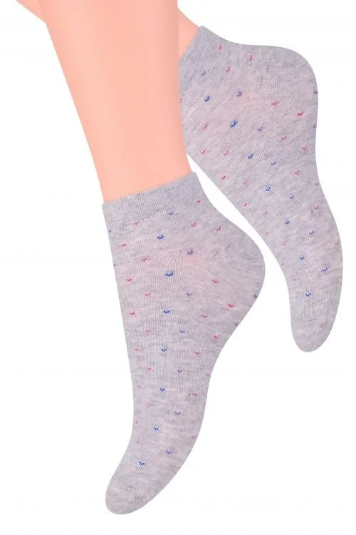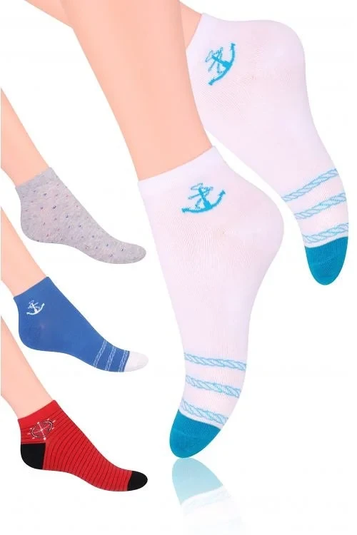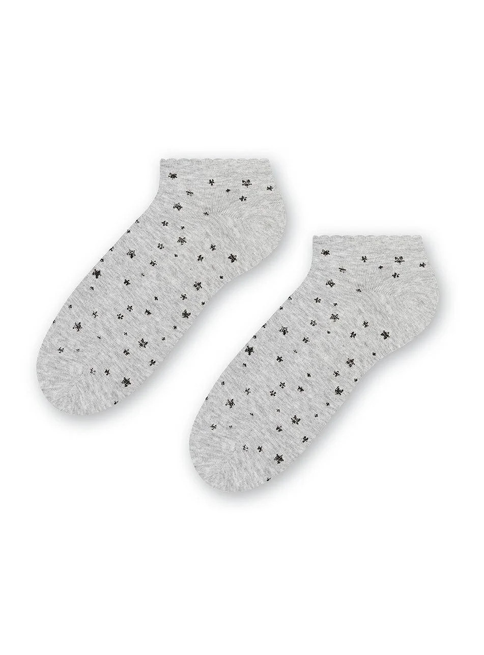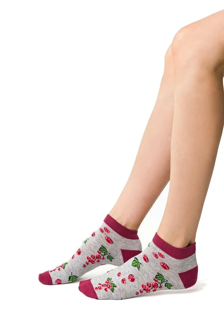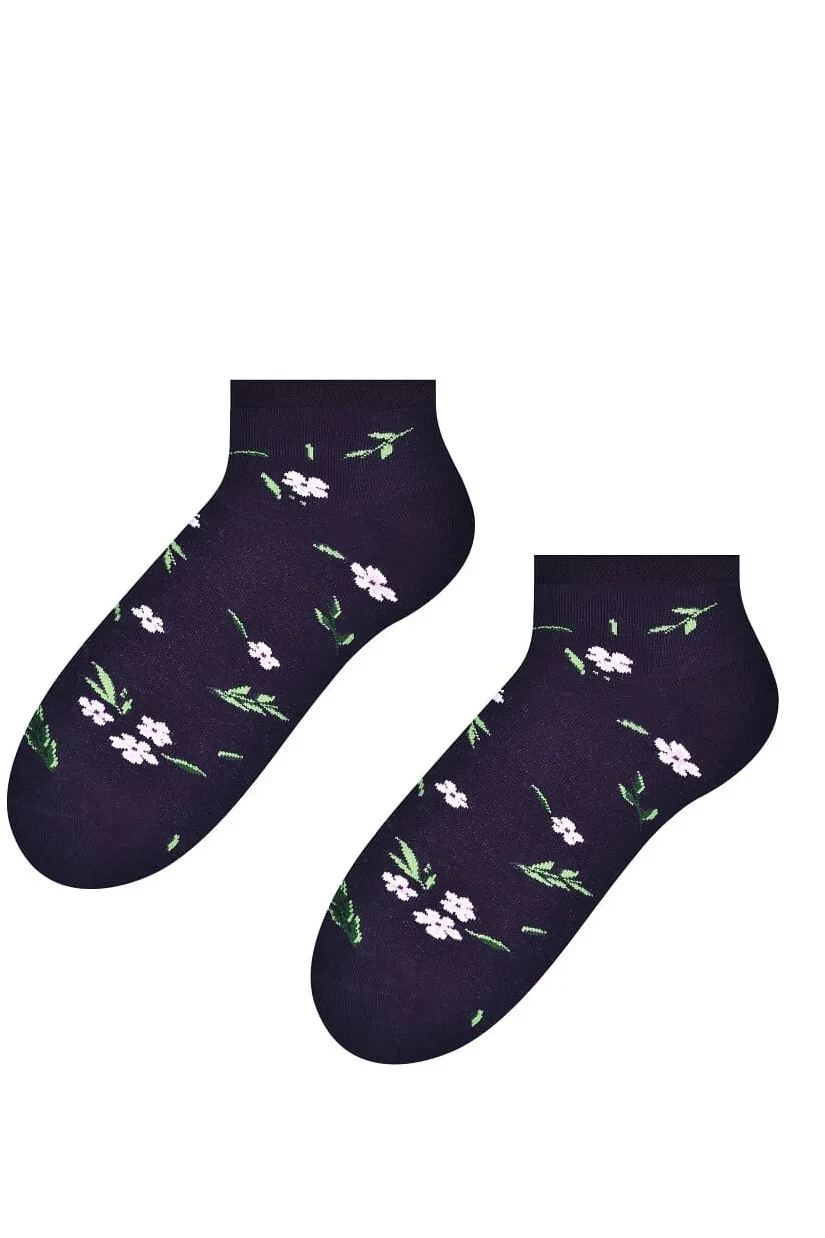 Dámské kotníkové ponožky s přídavkem elastických vláken. Mají nestahující lem. Ozdobené jsou různými vzory.