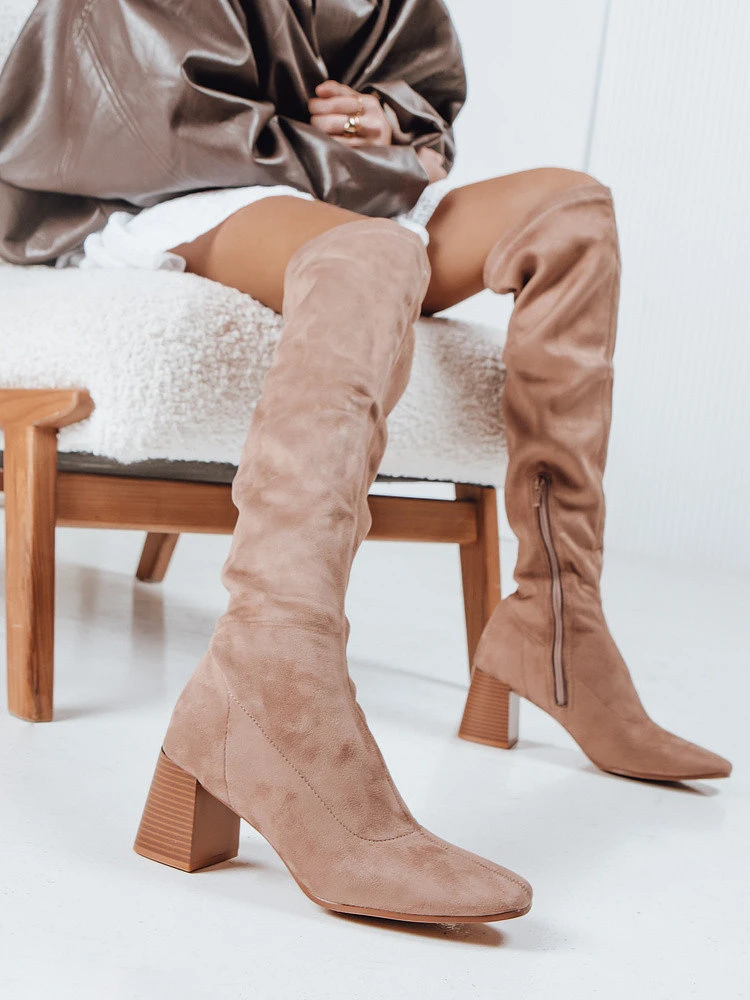 Stylové a ženské kozačky z ekologického semiše jsou návrhem pro milovnice nadčasové elegance. Model s prodlouženým vrškem sahajícím nad kolena krásně zvýrazňuje nohy a stabilní 7cm podpatek dodává siluetě lehkost a půvab. Jemná béžová barva činí kozačky mimořádně univerzálními - hodí se k šatům i džínům.