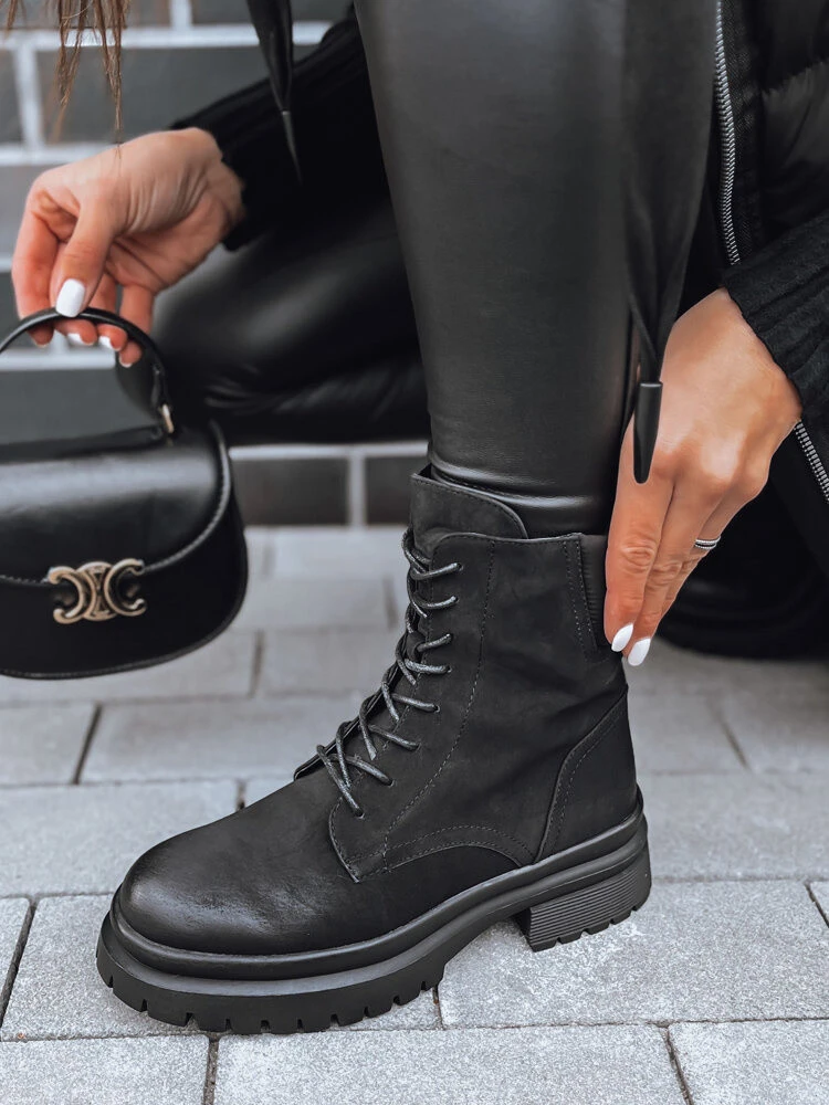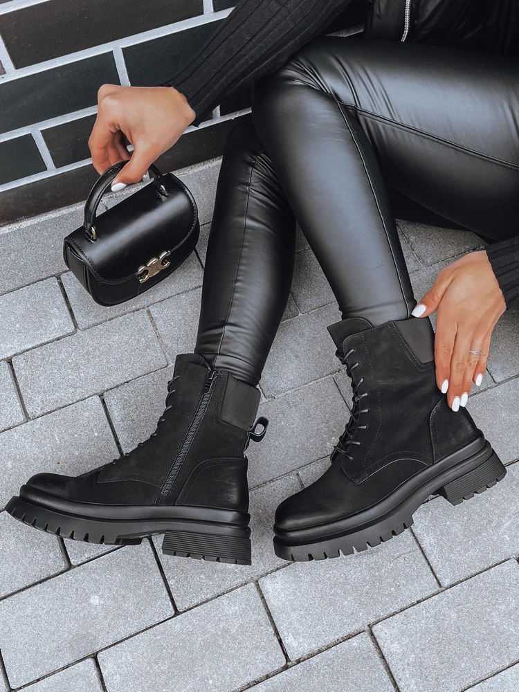 Tyto šněrovací kozačky vyrobené z kvalitní imitace semiše jsou nezbytným doplňkem při tvorbě podzimně-zimních outfitů. Sedí na silné podrážce a mají také zip na vnější straně boty. Budou vypadat perfektně ke kalhotám i šatům. Model je k dispozici ve čtyřech barvách.