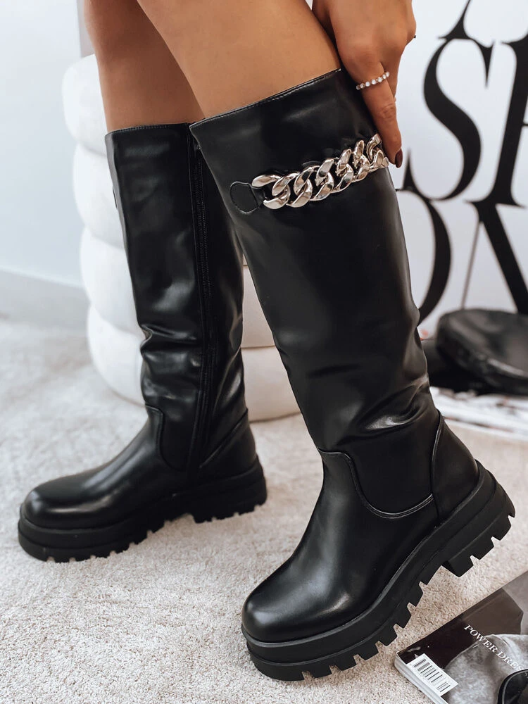 Originální kozačky JOLIA s pružným svrškem před kolena jsou perfektní volbou pro podzimně-zimní stylizaci. Nacházejí se na hrubé podrážce a poskytnou vám pohodlí a stylový vzhled. Skvěle budou prezentovat ležérní i elegantní kombinace. Ozdobný řetízek na boku rozzáří váš styling.
