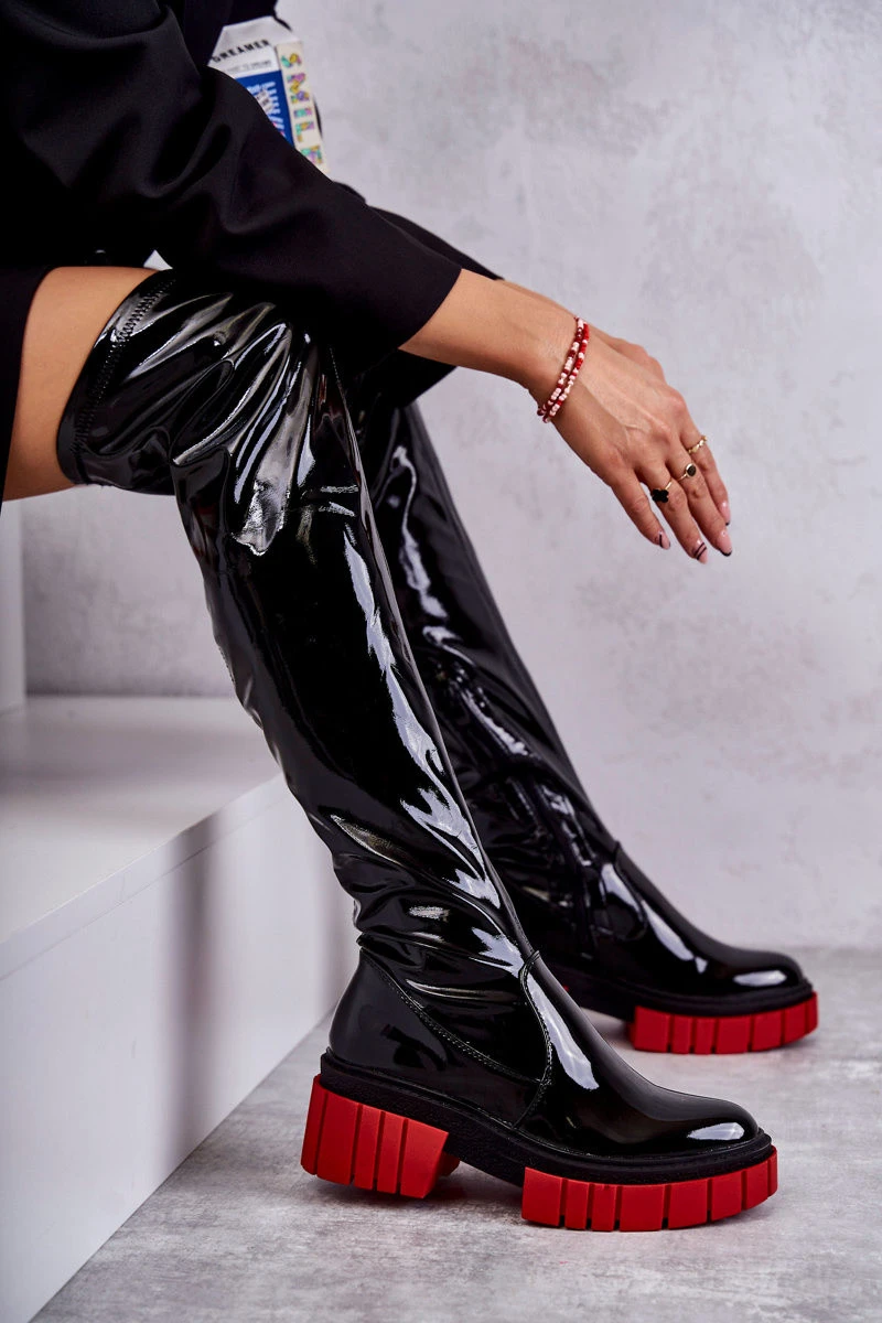 Krásné dámské kozačky se svrškem nad kolena. Model je vyroben z lakované eko kůže. Zapínání na zip na boční straně svršku. Kozačky jsou nasazeny na masivním plochém podpatku a platformě. Navíc mají izolaci v podobě přikrývky na obuv pouze ve výšce chodidla. Vyztužená pata. Díky tomuto střihu budete vyčnívat z davu! Při výběru velikosti použijte tabulku velikostí.