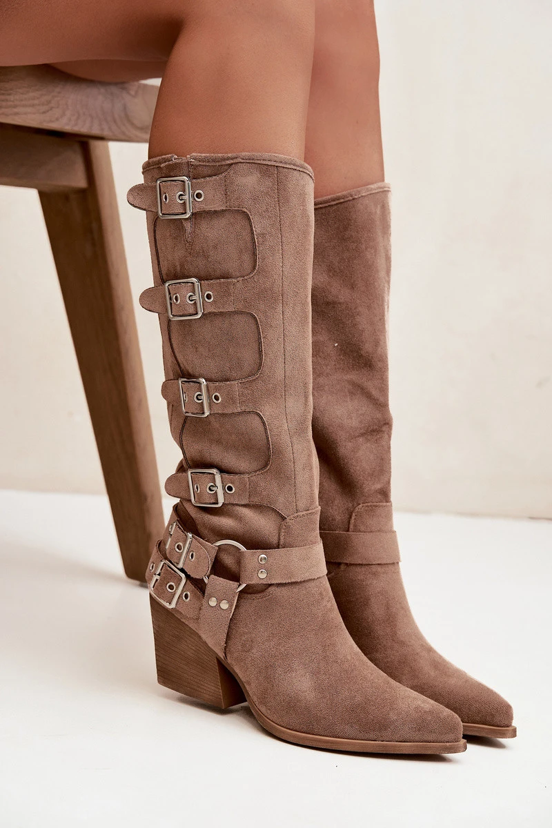 Dámské kozačky kovbojského stylu na podpatku s přezkami Fivelle – tmavě béžové