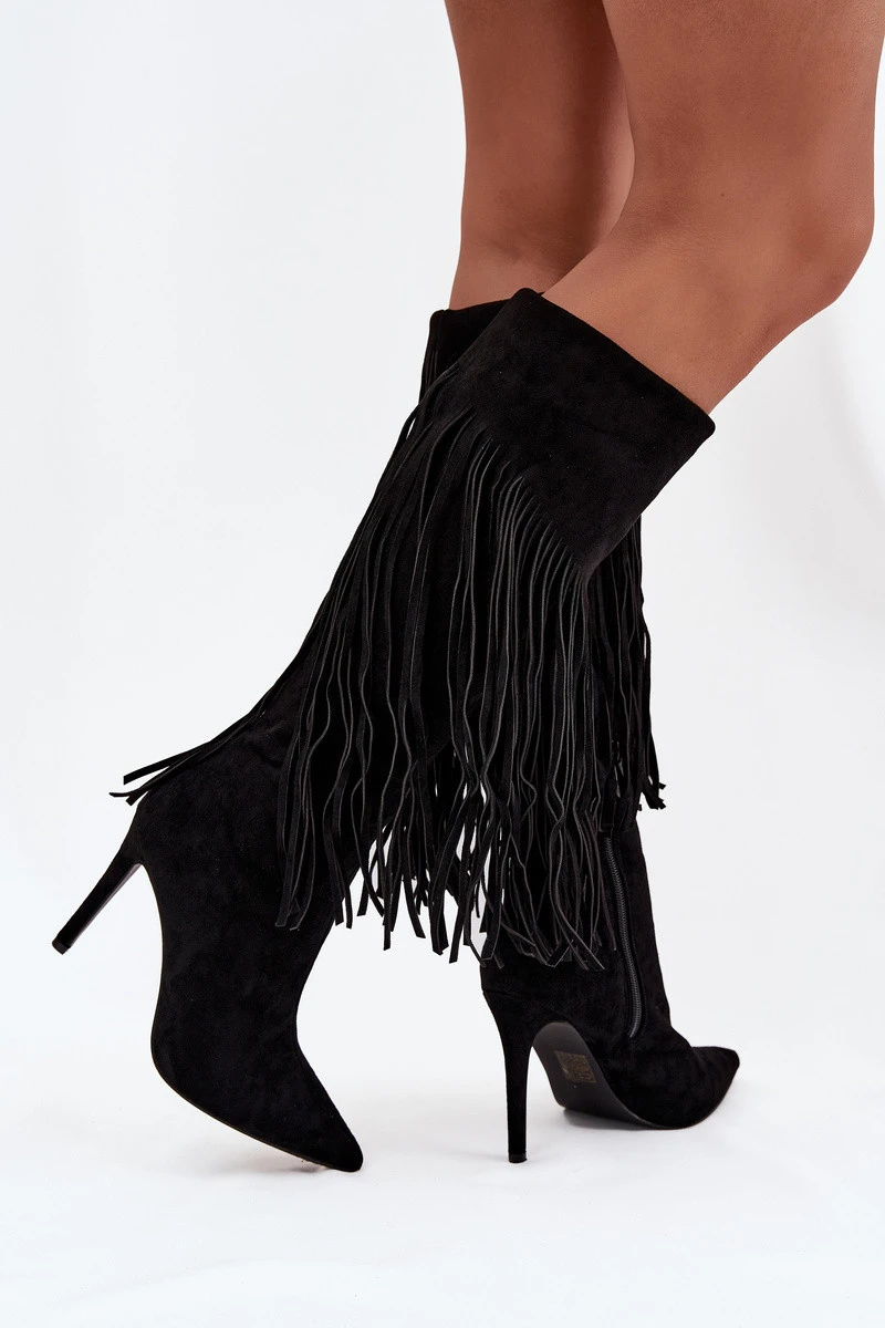 Dámské kozačky na jehlovém podpatku s třásněmi černé model 21709824 - Boto