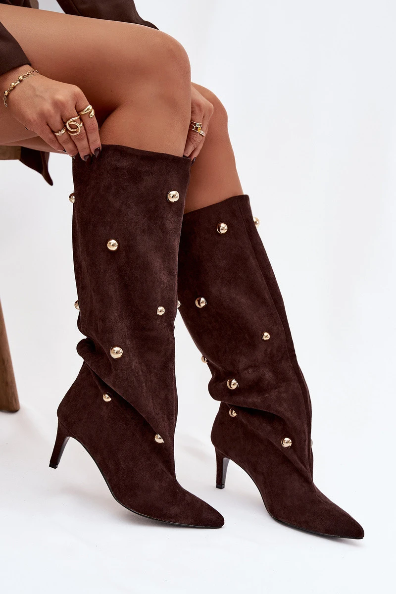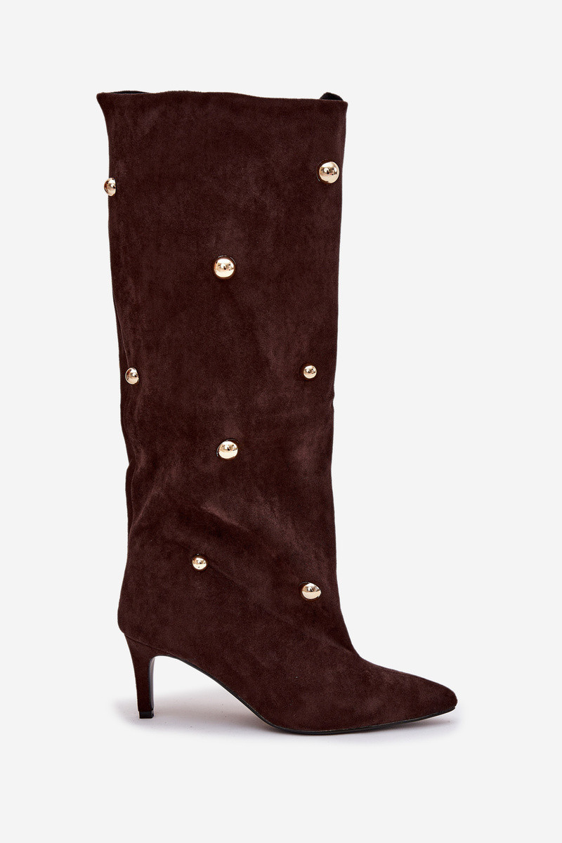 dámské kozačky na jehlovém podpatku se zlatými ozdobami hnědé model 21757799 - Boto