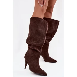 dámské kozačky na jehlovém podpatku z eko semiše čokoládové model 21715336 - Boto