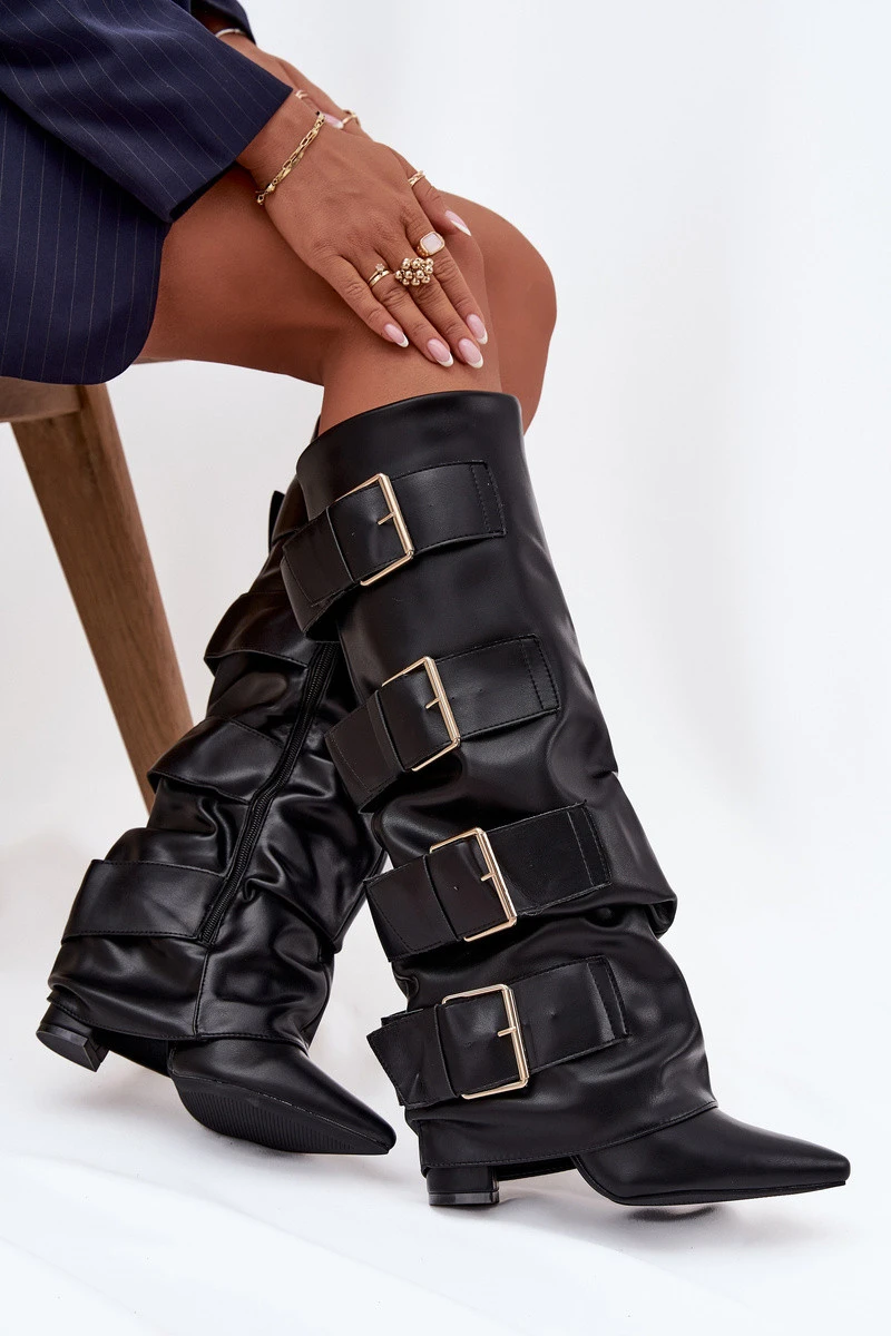 Stylové dámské kozačky z eko kůže jsou spojení elegance a moderního vzhledu. Umístěné na podpatek typu sloup, s špičatými špičkami, podtrhují ženskou siluetu. Vytočený límec ozdobený zlatými přezkami přitahuje pozornost a dodává charakter, zatímco zip usnadňuje rychlé nazutí a sejmutí. Skvěle se hodí k šatům a sukním, přidávají módní, rafinovaný akcent každému stylu. Při výběru velikosti se řiďte tabulkou velikostí. Při výběru velikosti se řiďte tabulkou velikostí.