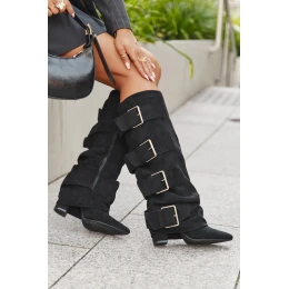 Dámské kozačky na podpatku s obráceným lemem a zlatými přezkami ekologický semiš černé Isavelle