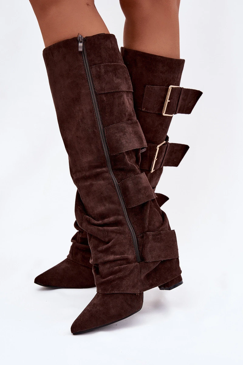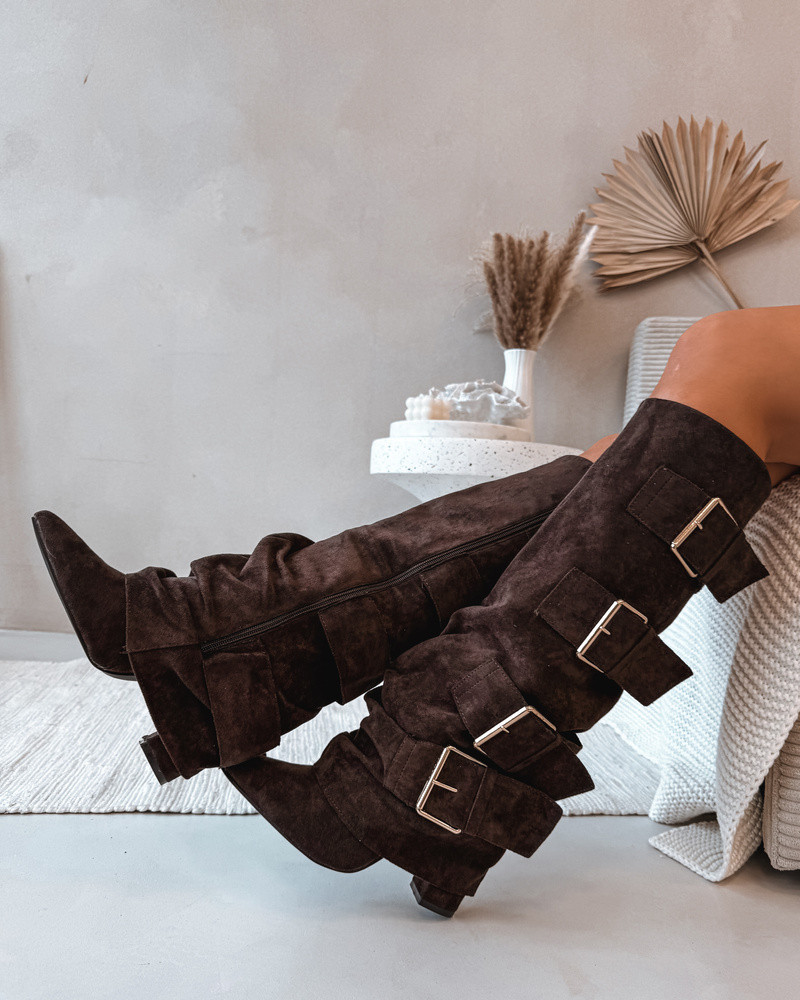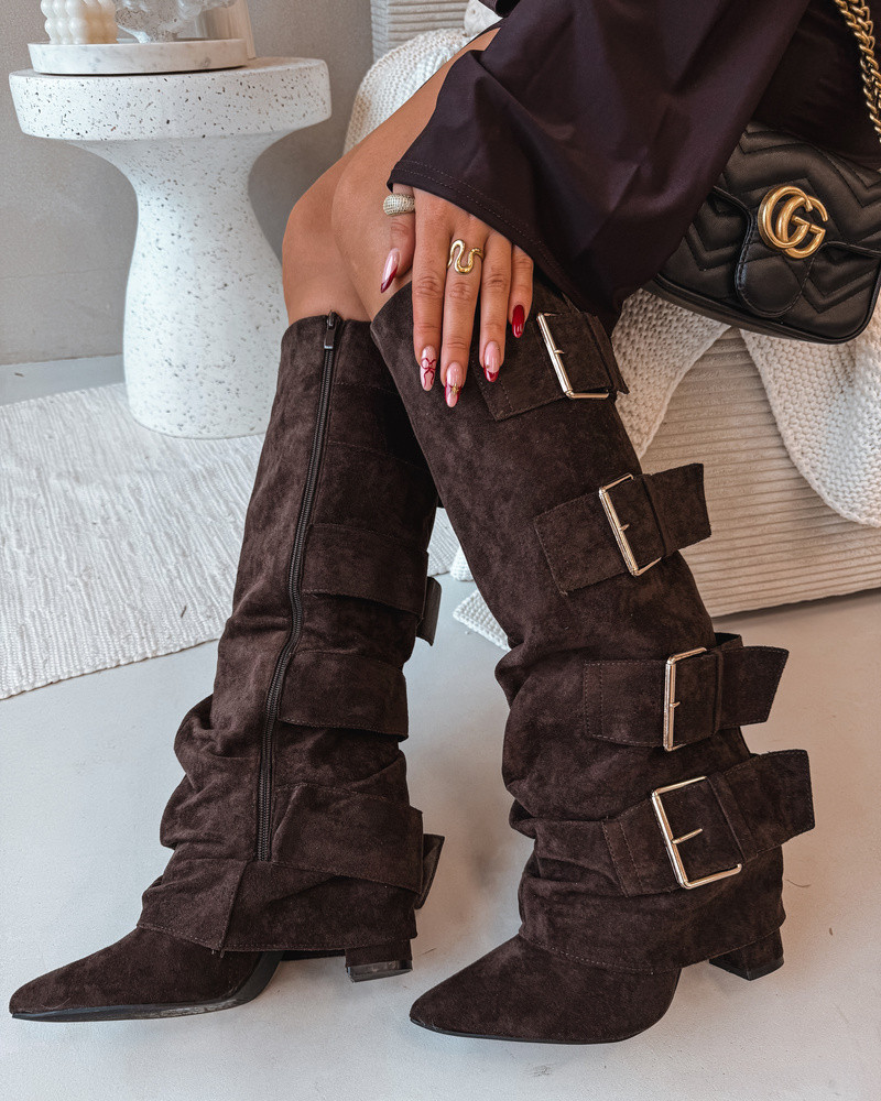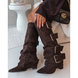 Dámské kozačky na podpatku s ohnutým horním lemem a zlatými sponami Eco semiš čokoládové Isavelle