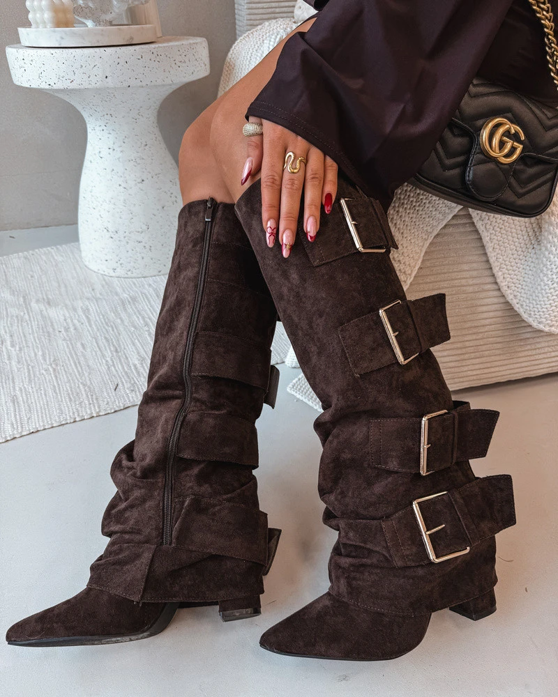 Stylové dámské kozačky z eko semiše jsou spojení elegance a moderního vzhledu. Postavené na podpatku typu sloup, s špičatými špičkami, zdůrazňují ženskou postavu. Vyklopená klopa, ozdobená zlatými přezkami, přitahuje pozornost a dodává charakter, a zip usnadňuje rychlé nazutí a sundání. Skvěle se hodí k šatům a sukním, vnášejí do každého outfitu módní, vybraný akcent. Při výběru velikosti se řiďte tabulkou velikostí. Při výběru velikosti se řiďte tabulkou velikostí.