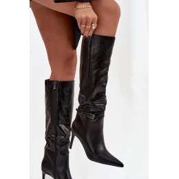 Dámské kozačky vyrobené z eko kůže jsou návrhem pro ženy, které ocení eleganci a ženský styl. Model na štíhlém podpatku krásně zvýrazní siluetu, dodávajíc jí lehkost a šik. Špičaté nosy opticky zeštíhlují nohy. Boty se zapínají na zip, což zajišťuje pohodlí při oblékání a svlékání. Spodní část kozaček je ozdobena páskem s přezkou, který tvoří jemný a zároveň výrazný dekorativní prvek. Jsou ideální na speciální příležitosti a večerní výlety — stylové, ženské a elegantní, skvěle kombinovatelné jak s sukněmi, tak s přiléhavými kalhotami. Při výběru velikosti se řiďte tabulkou velikostí. Při výběru velikosti se řiďte tabulkou velikostí.
