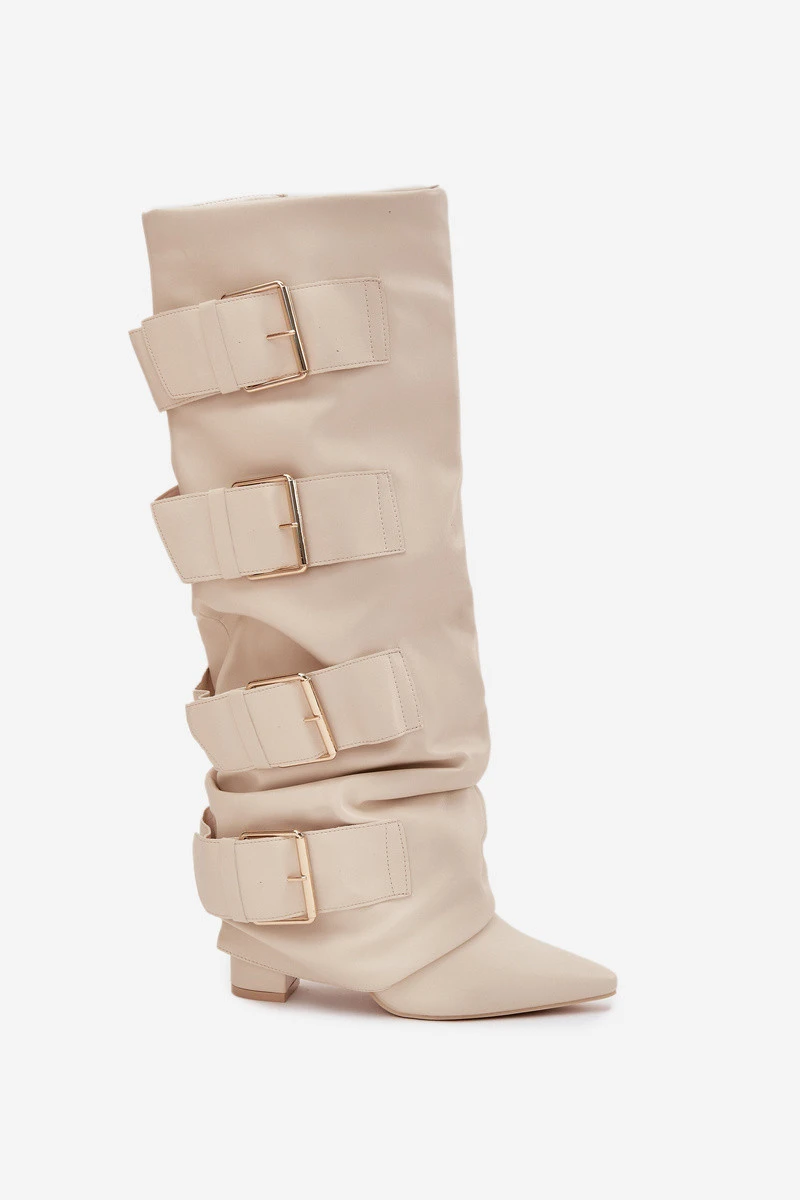Dámské kozačky na podpatku se a zlatými přezkami světle béžové model 21708837 - Boto