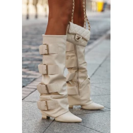 Dámské kozačky na podpatku se zkroutěnou holínkou a zlatými přezkami světle béžové Isavelle