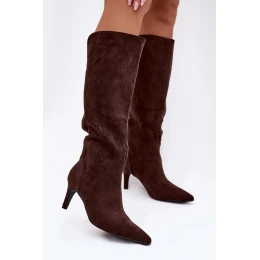 Dámské kozačky vyrobené z měkkého eko semiše jsou elegantní a ženskou volbou na chladnější dny. Model na štíhlém podpatku krásně zeštíhluje nohy. Špičaté špičky. Vyhřívané vnitřní část obuvi poskytuje příjemné teplo a komfort při nošení. Kozačky jsou nazouvací, což usnadňuje jejich obouvání. Skvělá volba na každý den i k elegantnějším outfitům. Při výběru velikosti se řiďte tabulkou velikostí.