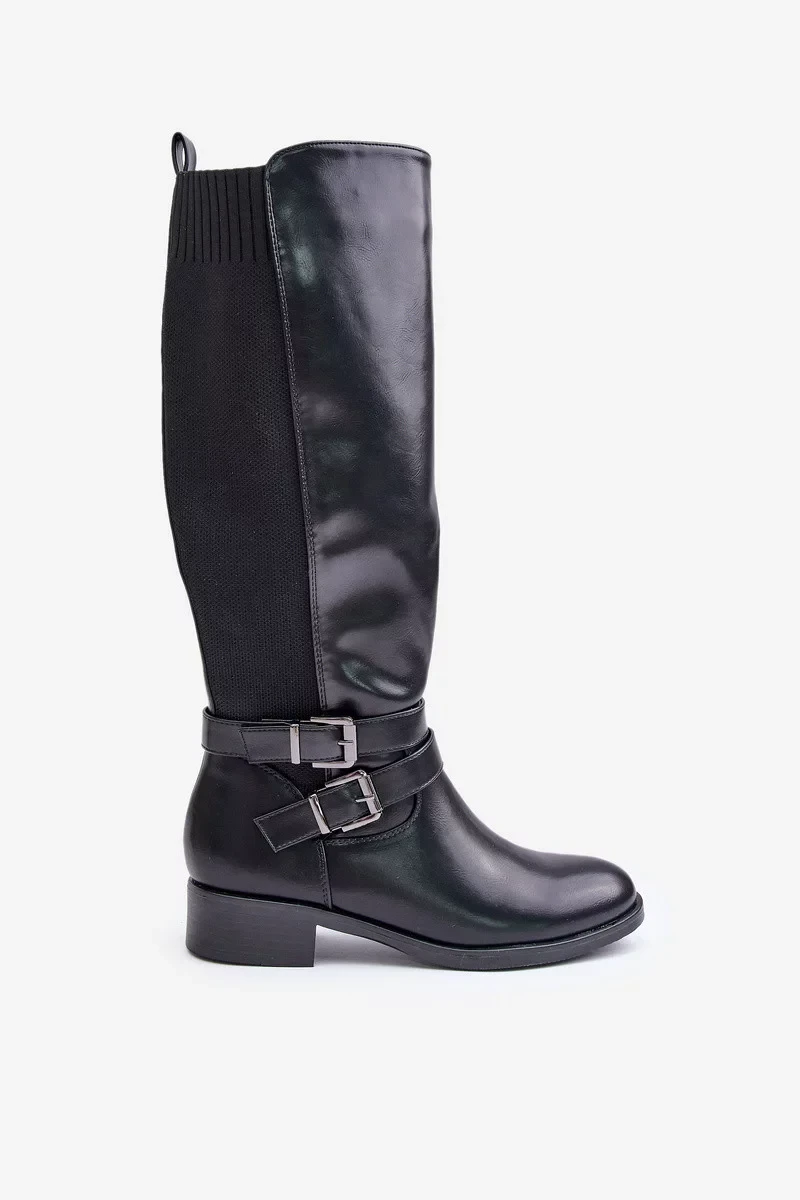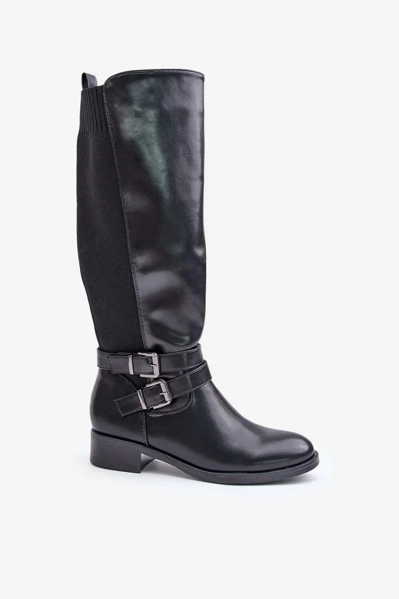 Dámské Kozačky Pod Kolena Na Plochém Podpatku S Přezkami Černé Lotina