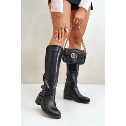 Dámské Kozačky Před Koleno Na Ploché Podpatky S Přezkami Černé Lotina