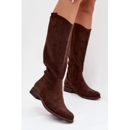Dámské kozačky s krajkovým vzorem na nízkém podpatku model 22031871 Čokoládové - S.Barski