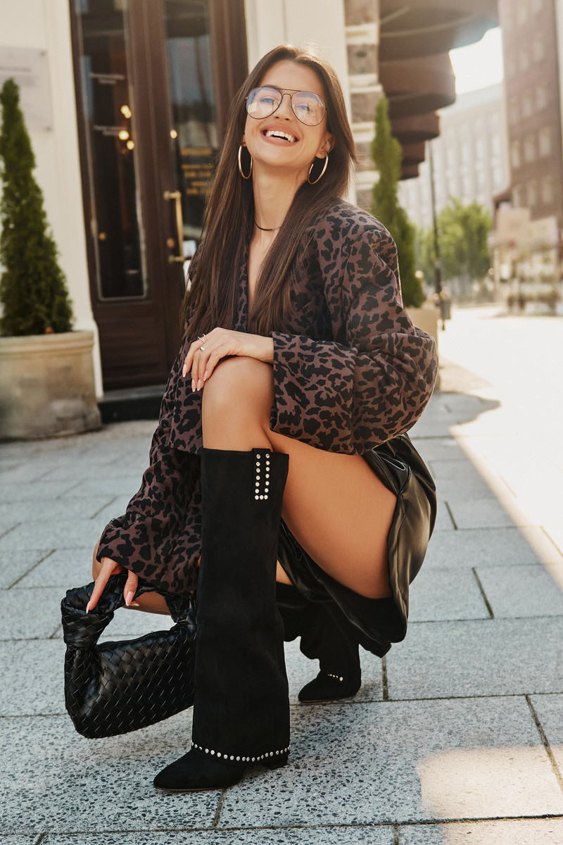 Dámské kozačky s volným svrškem vyrobené z eko semiše. Usazené na stabilním sloupkovém podpatku, s špičatými špičkami, které dodávají rafinovaný charakter. Vnitřek zateplený obuvnickou vlnou zajišťuje teplo v chladnějších dnech. Otočený svršek, který plynule přechází do podpatku, představuje výjimečný prvek tohoto modelu. Zapínají se na zip, skvěle se hodí k šatům a sukním a dodávají eleganci každému outfitu. Při výběru velikosti se řiďte tabulkou velikostí.