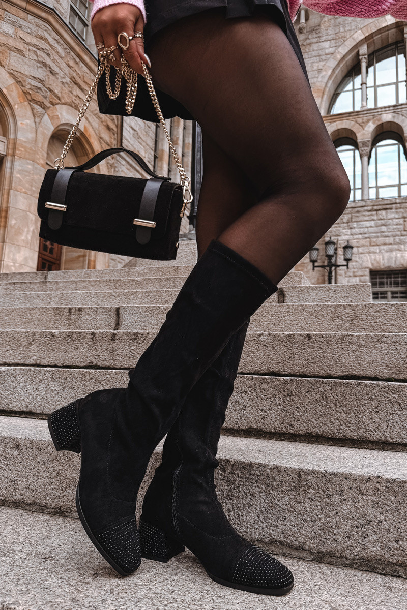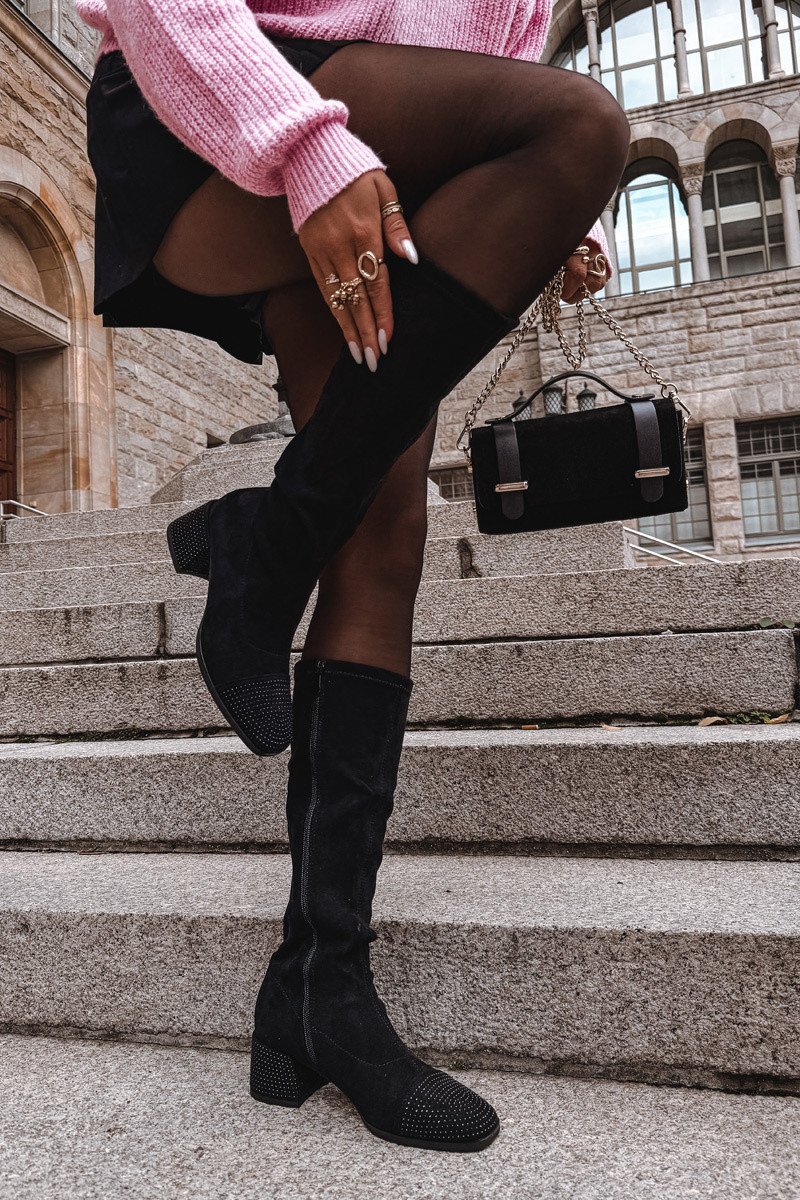 Dámské kozačky vyrobené z ekologického semiše jsou kombinací klasiky s nádechem moderního lesku. Model je umístěn na stabilním kockovém podpatku zdobeném lesklými cirkoniemi, které dodávají celku výjimečný, ženský charakter. Jemné zdobení je také umístěno na přední straně boty. Zapínají se na zip, jsou pohodlné na nošení a skvěle se přizpůsobí noze. Vnitřek je vyhříván pouze na úrovni chodidla měkkou obuvnickou dekou, což zajišťuje pohodlí a teplo v chladnější dny bez nadměrného přehřívání. Jemné prošití na límci přidává eleganci a opticky zeštíhluje nohu. Tyto stylové kozačky se skvěle hodí do formálnějších stylů, přinášejí trochu lesku do každého podzimního a zimního šatníku. Při výběru velikosti se prosím řiďte tabulkou velikostí. Při výběru velikosti se řiďte tabulkou velikostí.