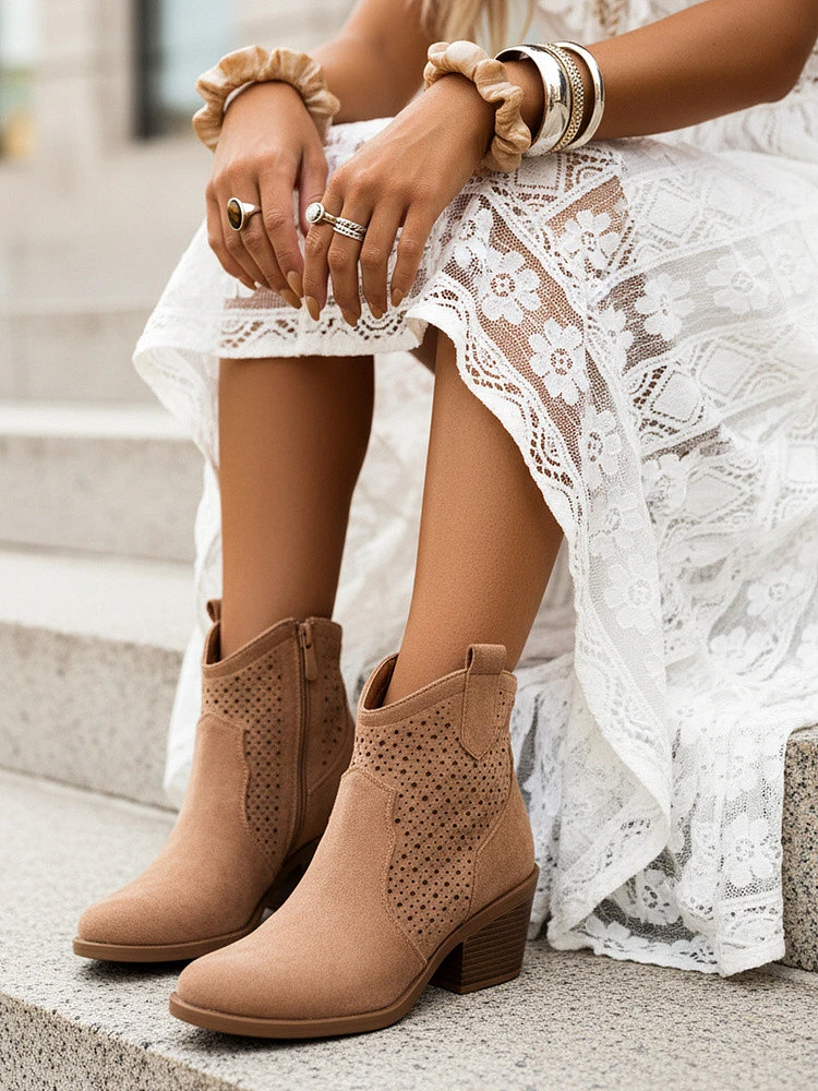 Dámské kozačky s lehkým střihem kombinují pohodlí při každodenním nošení s decentním stylem. Ažurový svršek jim dodává jemný charakter a zajišťuje lepší prodyšnost v teplejších dnech. Stabilní nízký podpatek zvyšuje pohodlí při chůzi během každodenních aktivit. Univerzální střih se hodí k mnoha stylizacím.
