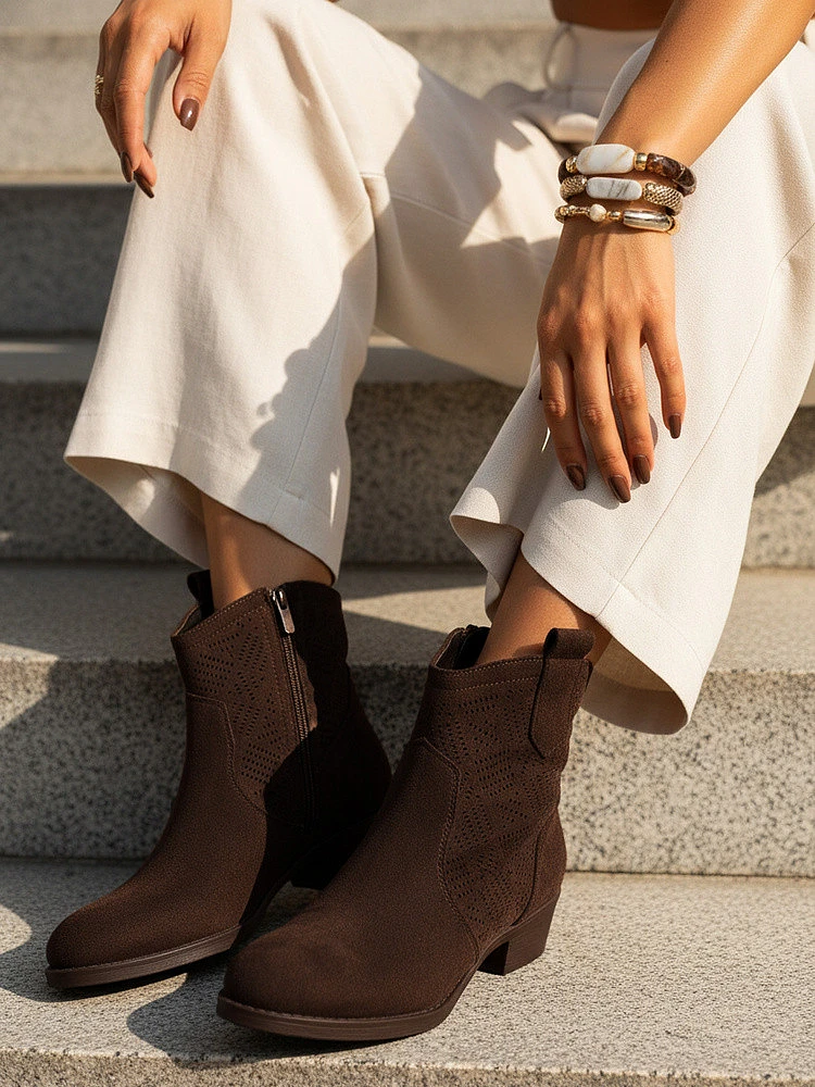 Dámské kozačky s prolamovaným svrškem na nízkém podpatku hnědé FashionStreet ZY1431