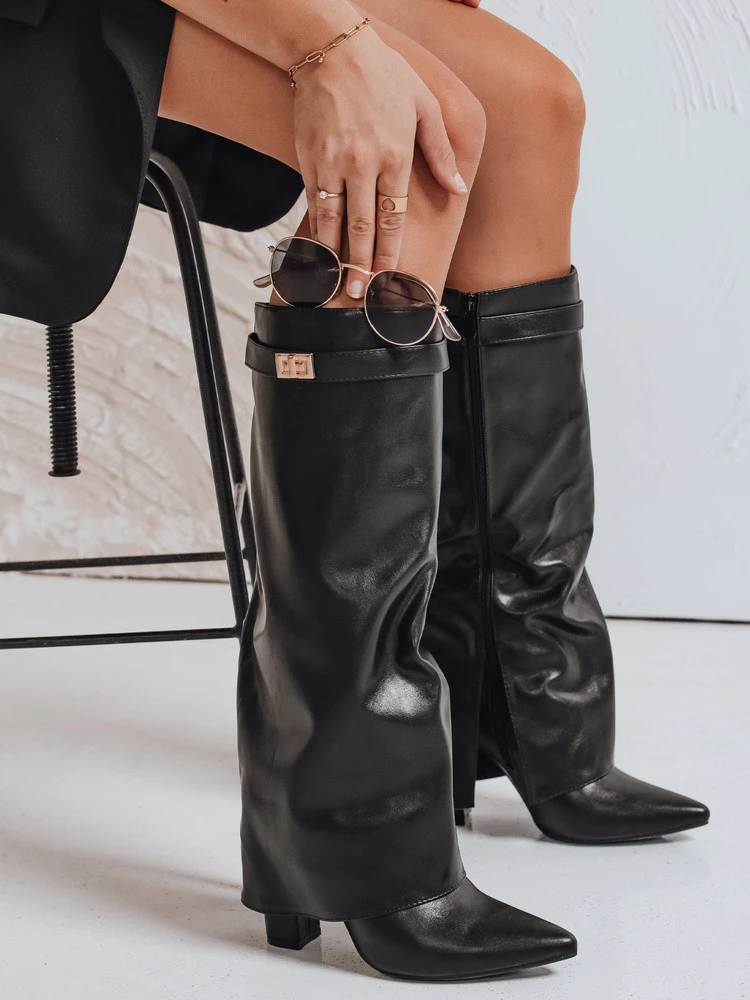 kozačky na podpatku s vysokým svrškem představují elegantní a osobitý styl. Měkká ekologická kůže vytváří hladký povrch, zatímco štíhlý nos podtrhuje moderní charakter modelu. Stabilní podpatek dodává výšku a zachovává pohodlí při každodenním nošení.
