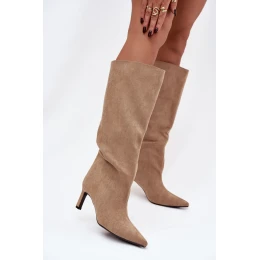Dámské kozačky z eko semiše nazouvací na jehlovém podpatku béžové Phelin