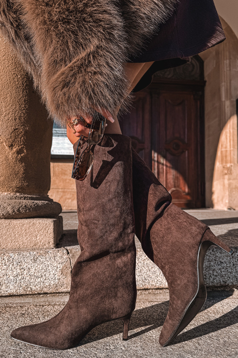 Dámské kozačky z eko semiše nazouvací na podpatku čokoládové model 21770283 - Boto