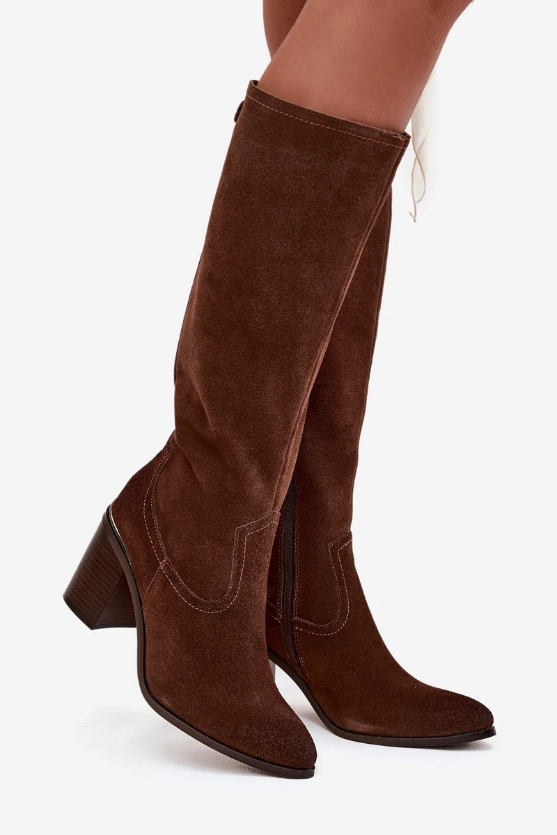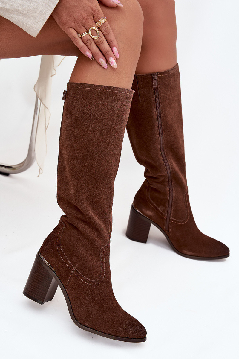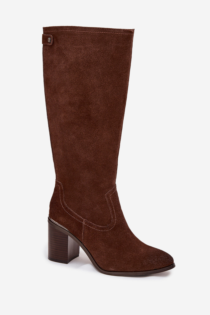 Dámské kozačky z přírodního semiše s vyhřátým podpatkem sloup Sergio Leone KZ25668-S hnědé