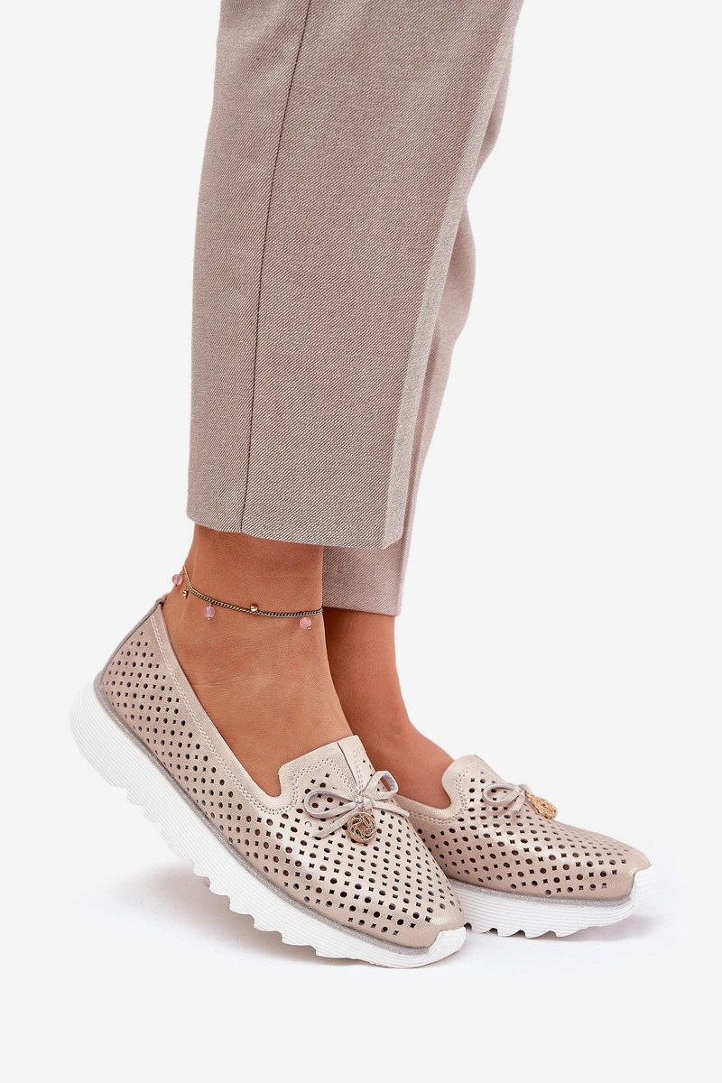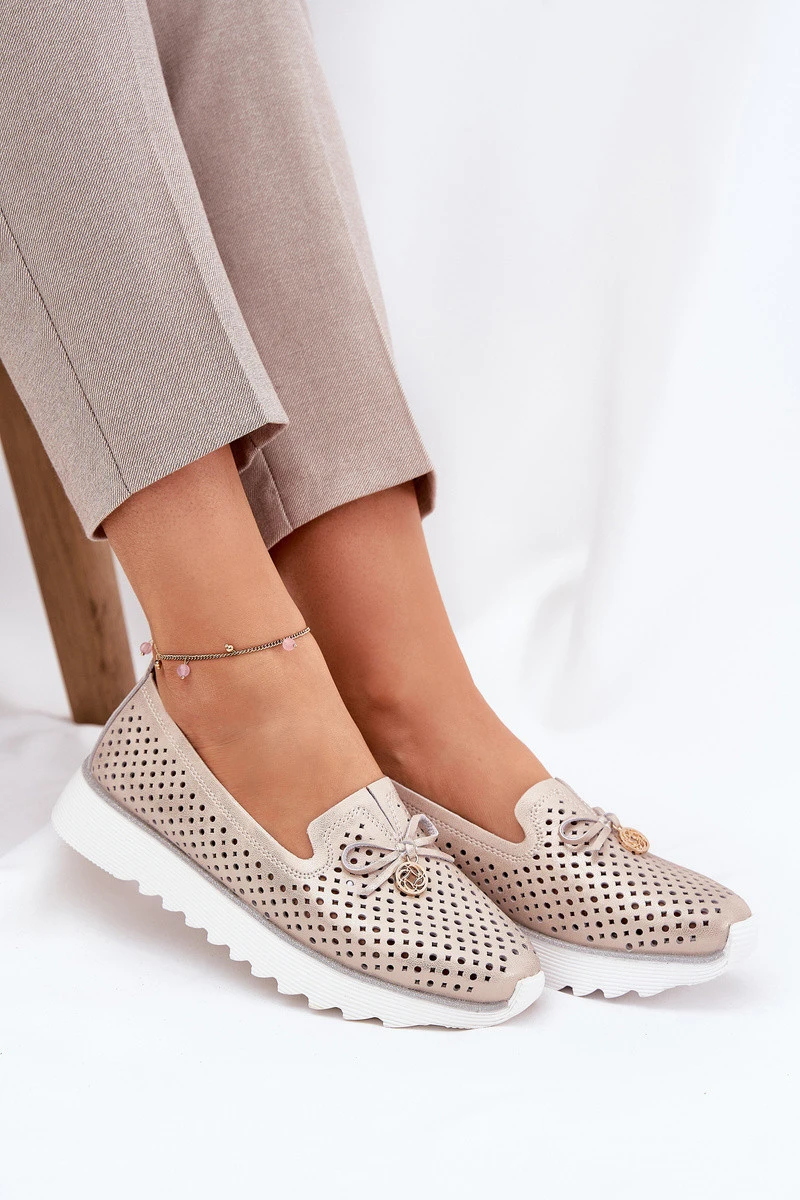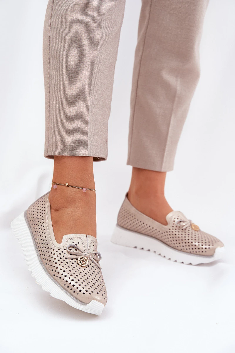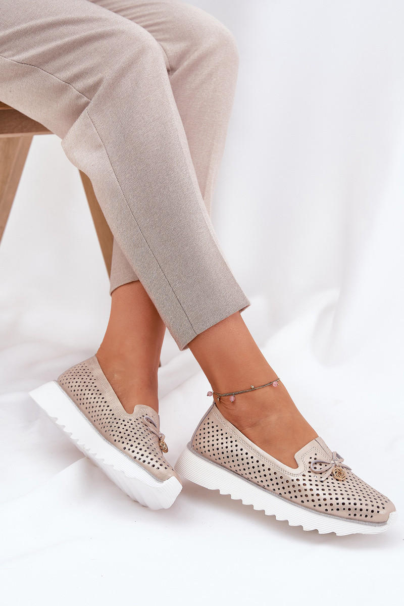 Elegantní, perforované dámské polobotky vyrobené z přírodní kůže, umístěné na platformě, které spojují komfort s jemným stylem. Zaoblené špičky zajišťují pohodlí a na přední části bot se nachází mašlička a jemný detail, který jim dodává kouzlo. Kožená, měkká stélka zaručuje pohodlí po celý den. Tyto polobotky budou ideální volbou na každodenní nošení, spojující eleganci s funkčností a hodící se k mnoha stylizacím. Při výběru velikosti se řiďte tabulkou velikostí.