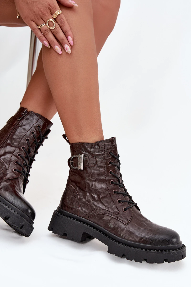 Dámské kožené botky Artiker – hnědé, s efektem mačkání a s přezkou