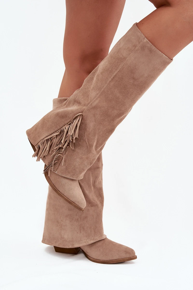 Dámské Kožené Boty Na Podpatku S třásněmi Béžové Zalia