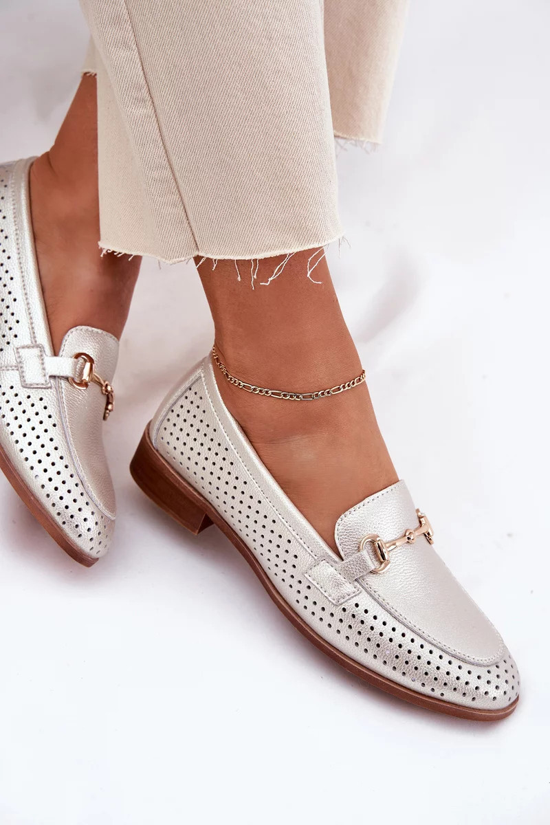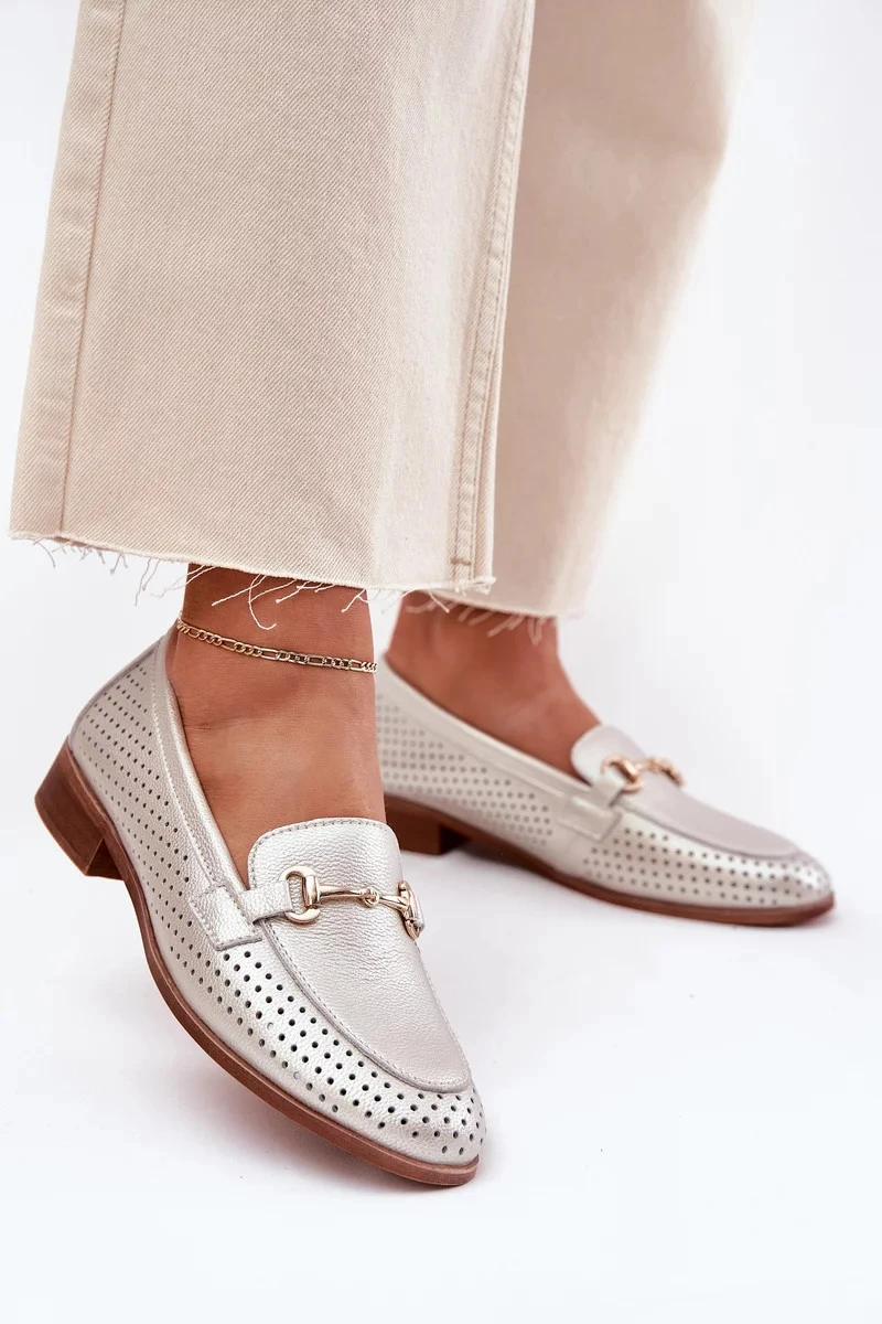Dámské kožené mokasíny se zdobením na plochém podpatku S.Barski – stříbrné